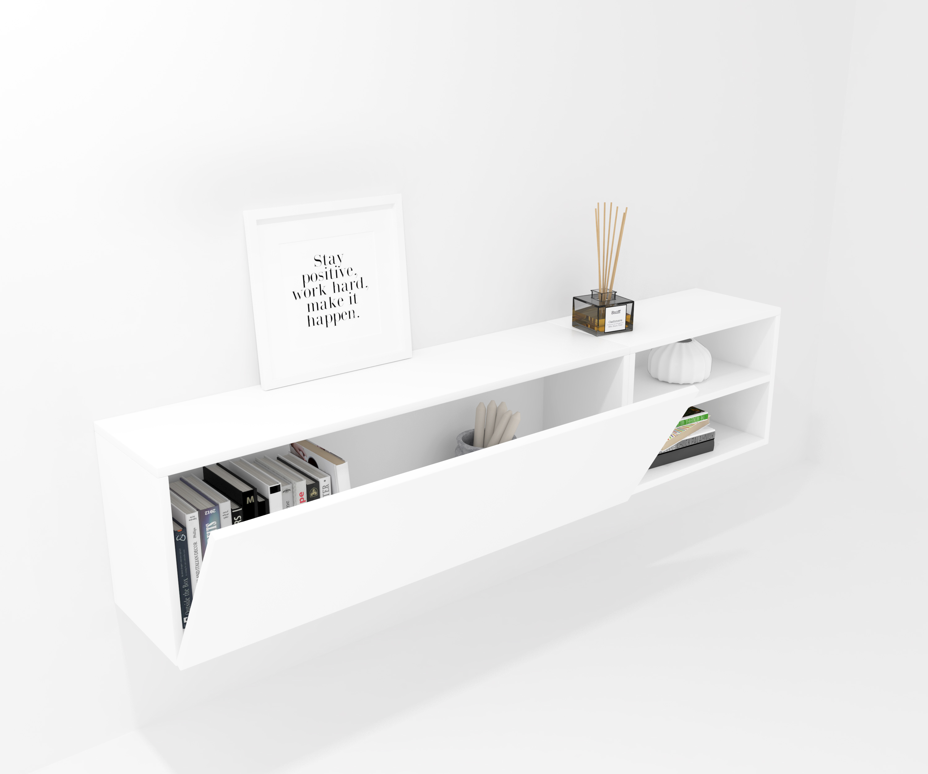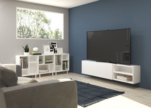 Ensemble composé d'une armoire avec une porte à charnières et d'un meuble décoratif. Une infinité de combinaisons possibles avec tous les modules ou compositions de la collection CREA. Meubles en panneaux de particules laminés. Grande capacité de stockage à l'intérieur. Prêt à être accroché au mur avec la possibilité d'ajouter des pieds ou des roues. Il est livré démonté, facile à monter. Fabriqué en Espagne.