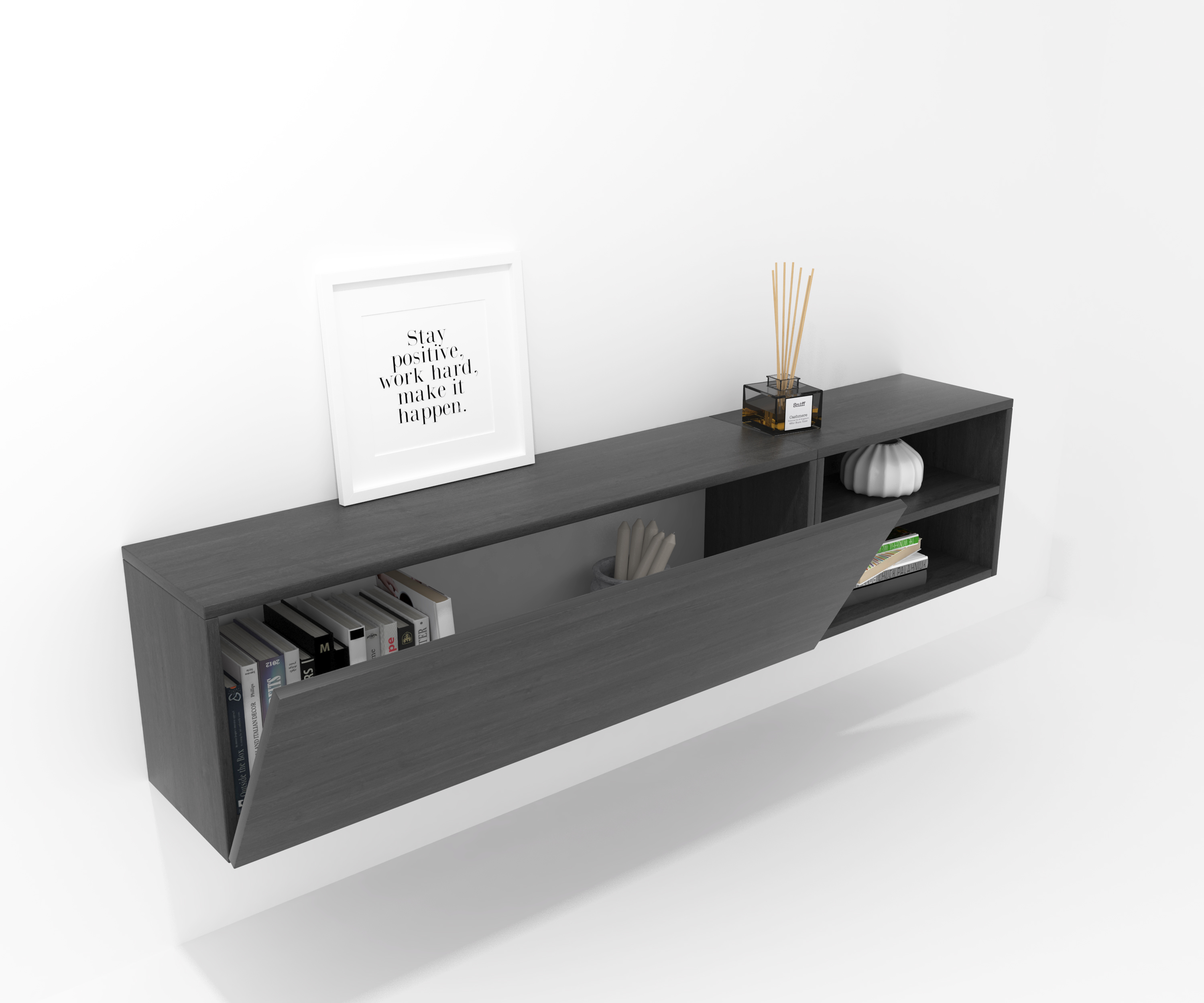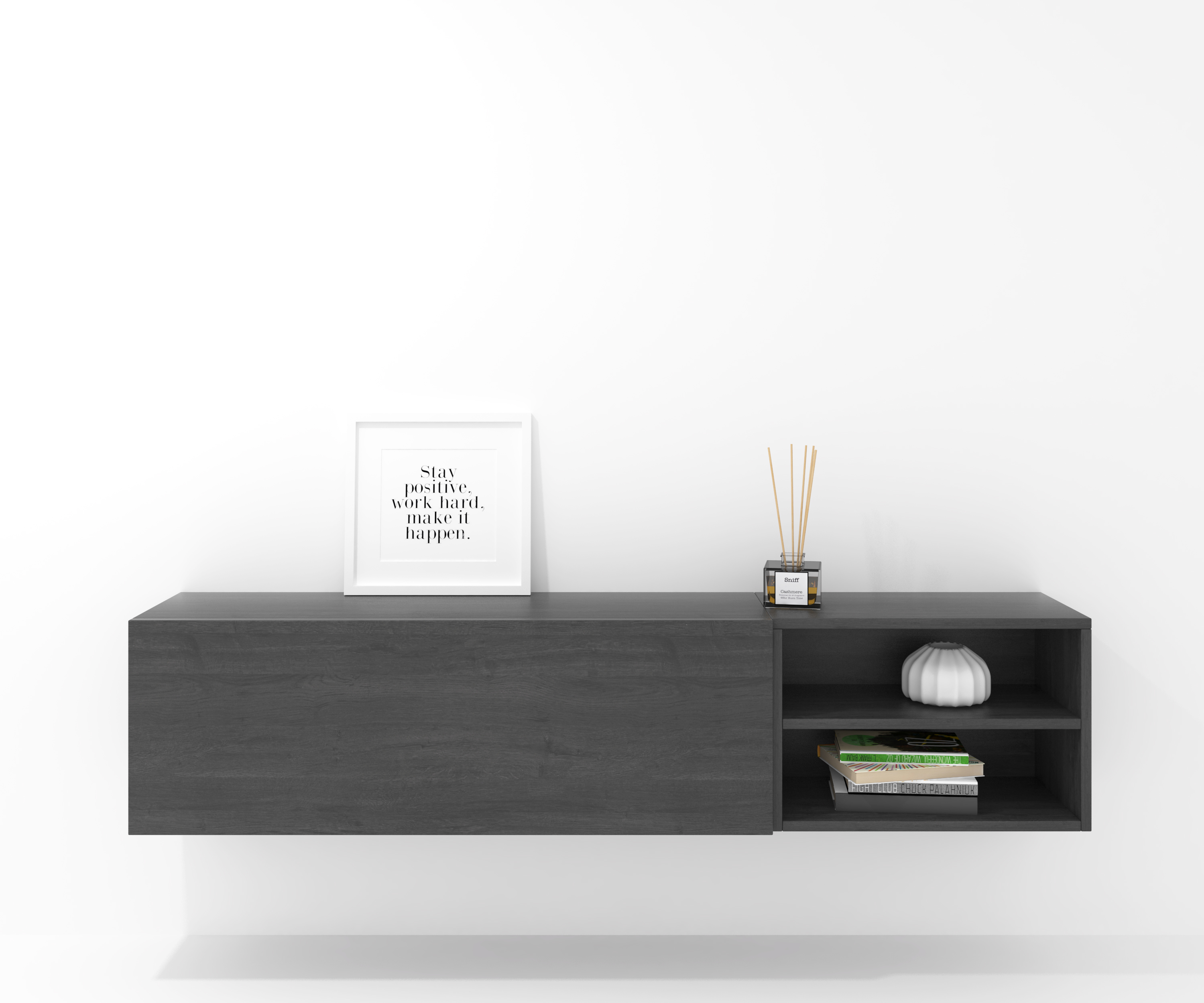 Ensemble composé d'une armoire avec une porte à charnières et d'un meuble décoratif. Une infinité de combinaisons possibles avec tous les modules ou compositions de la collection CREA. Meubles en panneaux de particules laminés. Grande capacité de stockage à l'intérieur. Prêt à être accroché au mur avec la possibilité d'ajouter des pieds ou des roues. Il est livré démonté, facile à monter. Fabriqué en Espagne.