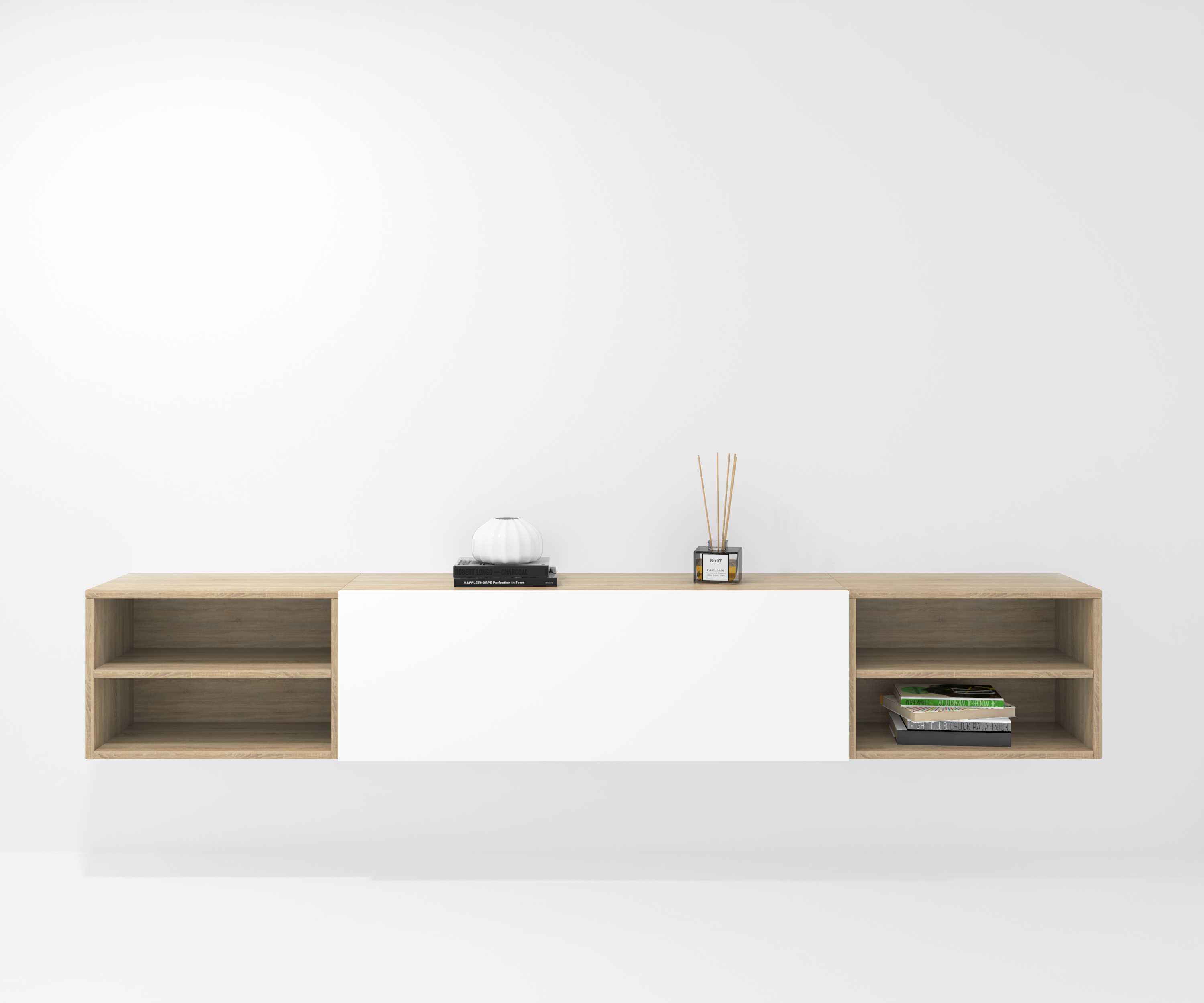 Ensemble composé de deux meubles à portes pliantes et d'un meuble décoratif. Une infinité de combinaisons possibles avec tous les modules ou compositions de la collection CREA. Meubles en panneaux de particules laminés. Grande capacité de stockage à l'intérieur. Prêt à être accroché au mur avec la possibilité d'ajouter des pieds ou des roues. Il est livré démonté, facile à monter. Fabriqué en Espagne.