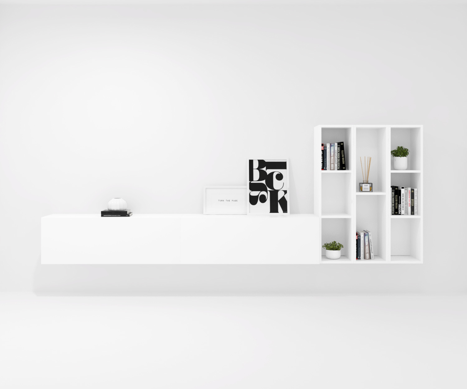 Ensemble composé de deux meubles à portes pliantes et de trois meubles décoratifs. Une infinité de combinaisons possibles avec tous les modules ou compositions de la collection CREA. Meubles en panneaux de particules laminés. Grande capacité de stockage à l'intérieur. Prêt à être accroché au mur avec la possibilité d'ajouter des pieds ou des roues. Il est livré démonté, facile à monter. Fabriqué en Espagne.