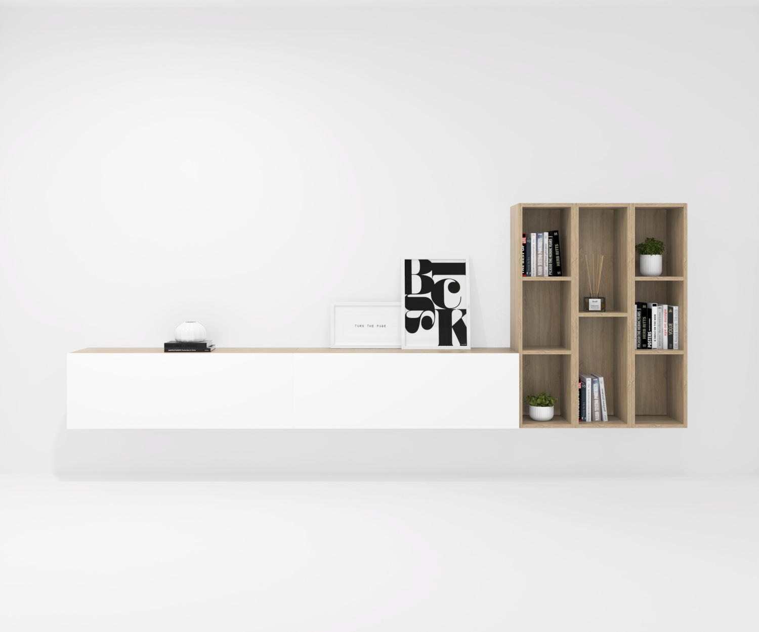 Ensemble composé de deux meubles à portes pliantes et de trois meubles décoratifs. Une infinité de combinaisons possibles avec tous les modules ou compositions de la collection CREA. Meubles en panneaux de particules laminés. Grande capacité de stockage à l'intérieur. Prêt à être accroché au mur avec la possibilité d'ajouter des pieds ou des roues. Il est livré démonté, facile à monter. Fabriqué en Espagne.