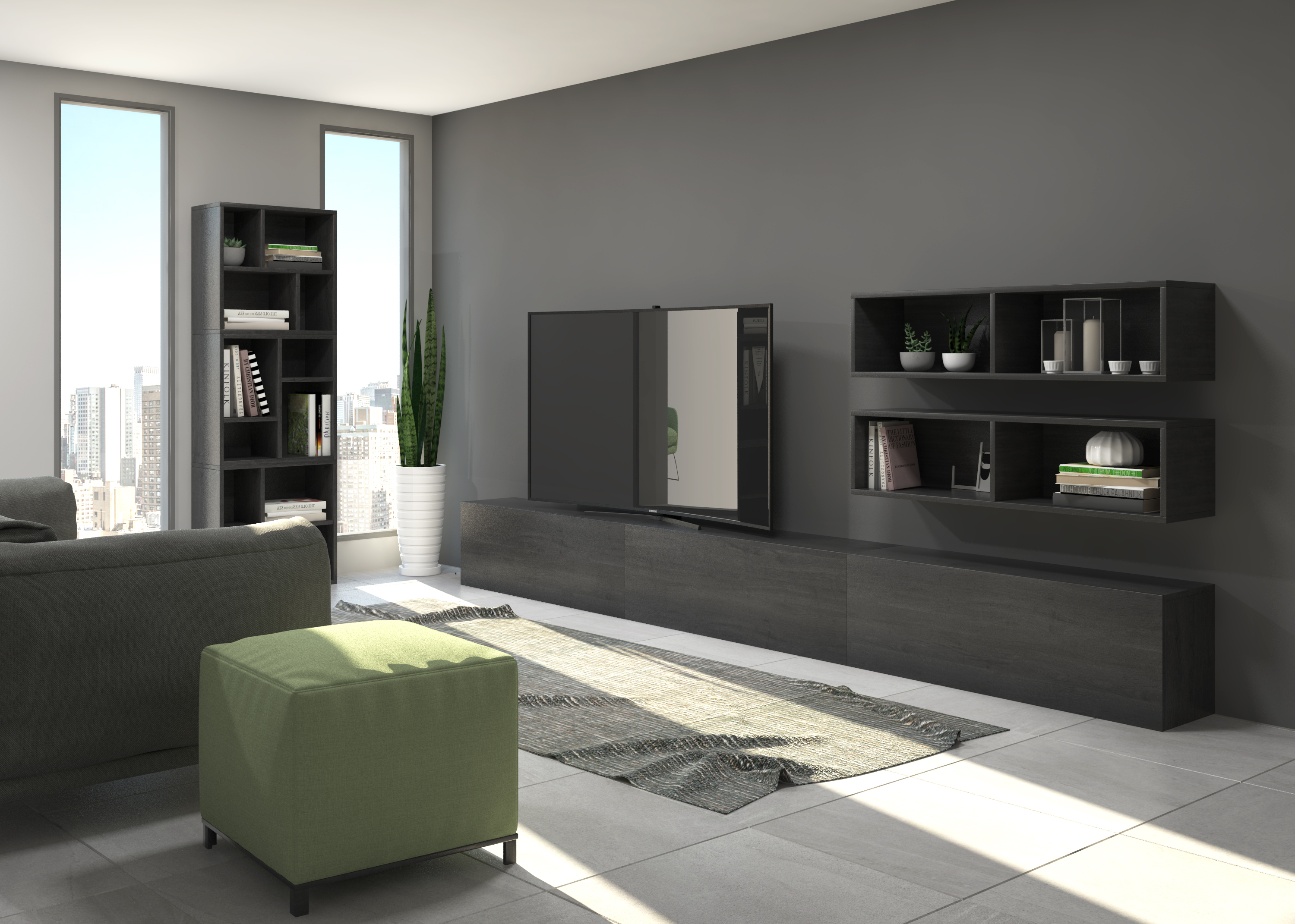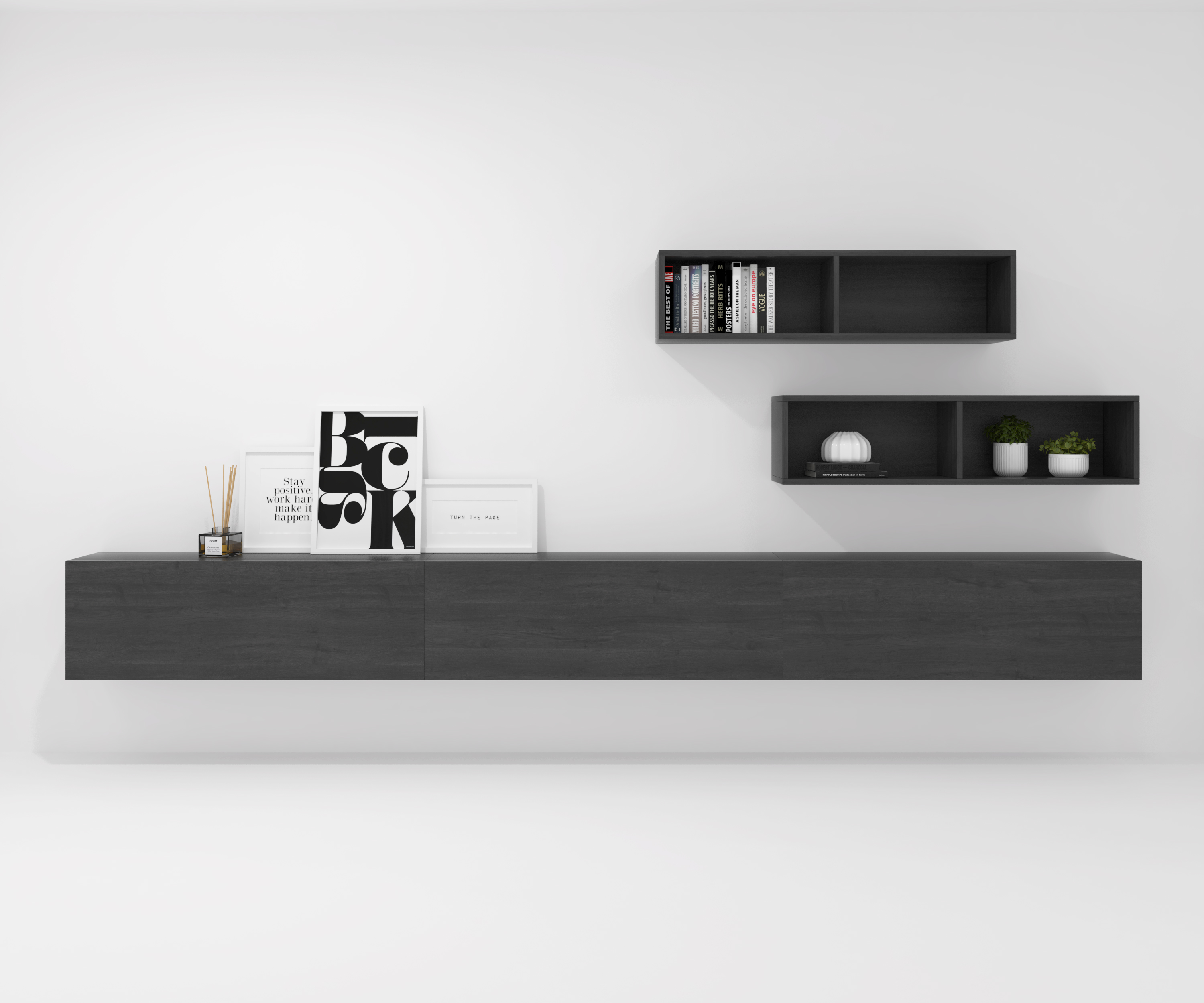 Ensemble composé de trois meubles à portes pliantes et de deux meubles décoratifs. Une infinité de combinaisons possibles avec tous les modules ou compositions de la collection CREA. Meubles en panneaux de particules laminés. Grande capacité de stockage à l'intérieur. Prêt à être accroché au mur avec la possibilité d'ajouter des pieds ou des roues. Il est livré démonté, facile à monter. Fabriqué en Espagne.