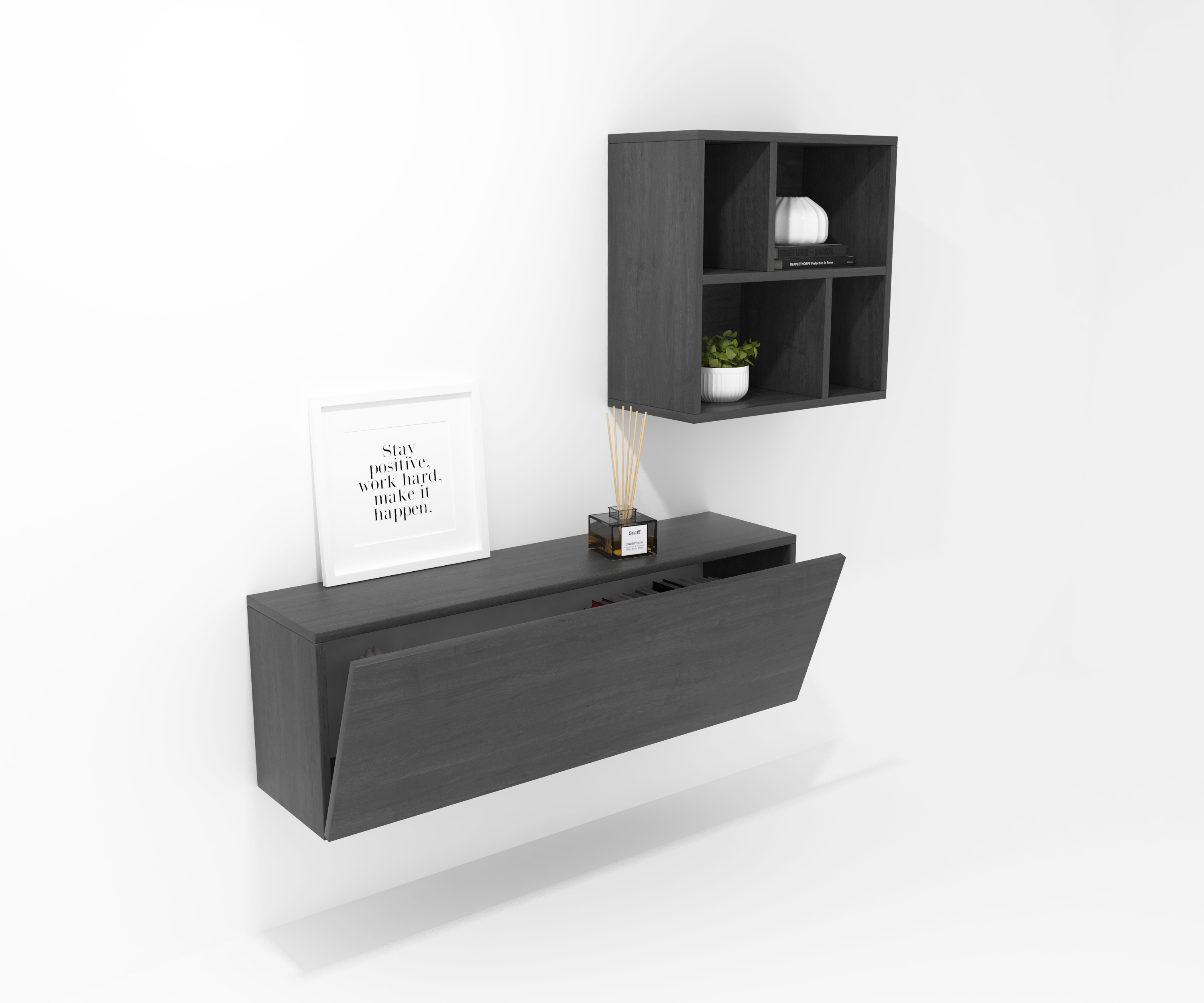 Ensemble composé d'une armoire avec une porte à charnières et d'un meuble décoratif. Une infinité de combinaisons possibles avec tous les modules ou compositions de la collection CREA. Meubles en panneaux de particules laminés. Grande capacité de stockage à l'intérieur. Prêt à être accroché au mur avec la possibilité d'ajouter des pieds ou des roues. Il est livré démonté, facile à monter. Fabriqué en Espagne.