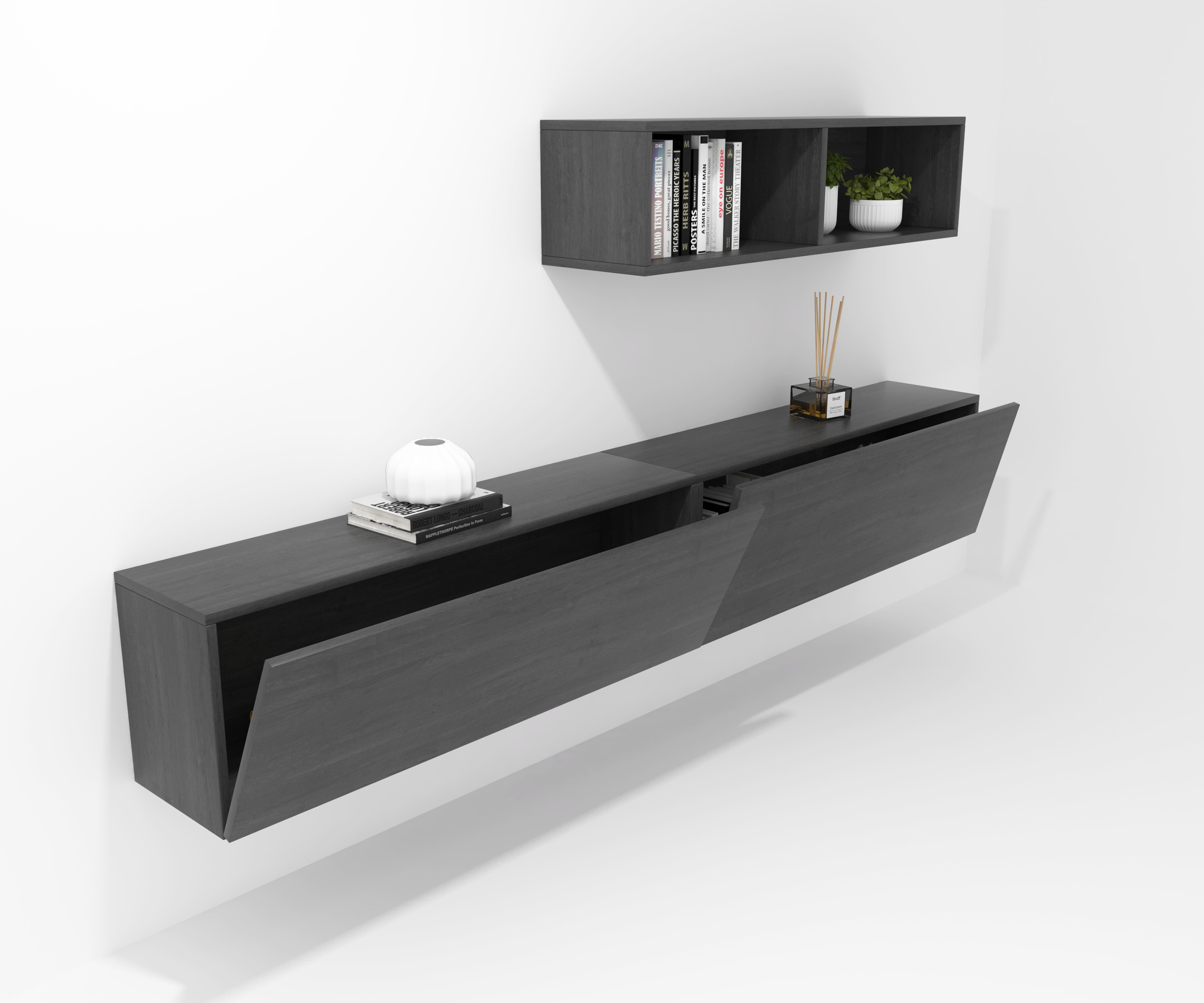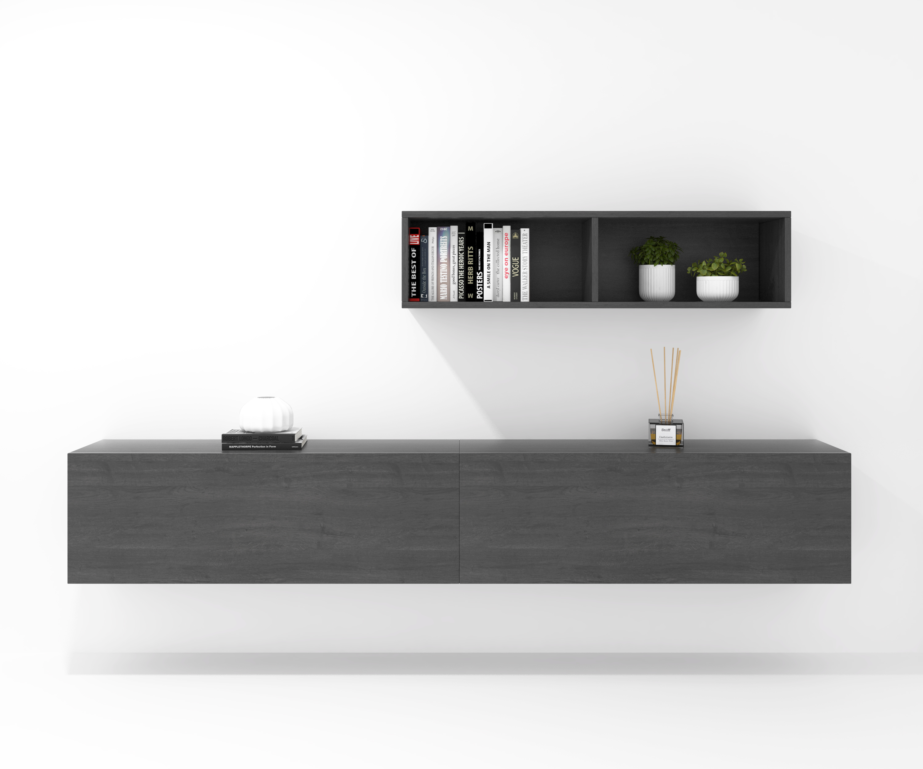 Ensemble composé de trois meubles à portes pliantes et de deux meubles décoratifs. Une infinité de combinaisons possibles avec tous les modules ou compositions de la collection CREA. Meubles en panneaux de particules laminés. Grande capacité de stockage à l'intérieur. Prêt à être accroché au mur avec la possibilité d'ajouter des pieds ou des roues. Il est livré démonté, facile à monter. Fabriqué en Espagne.