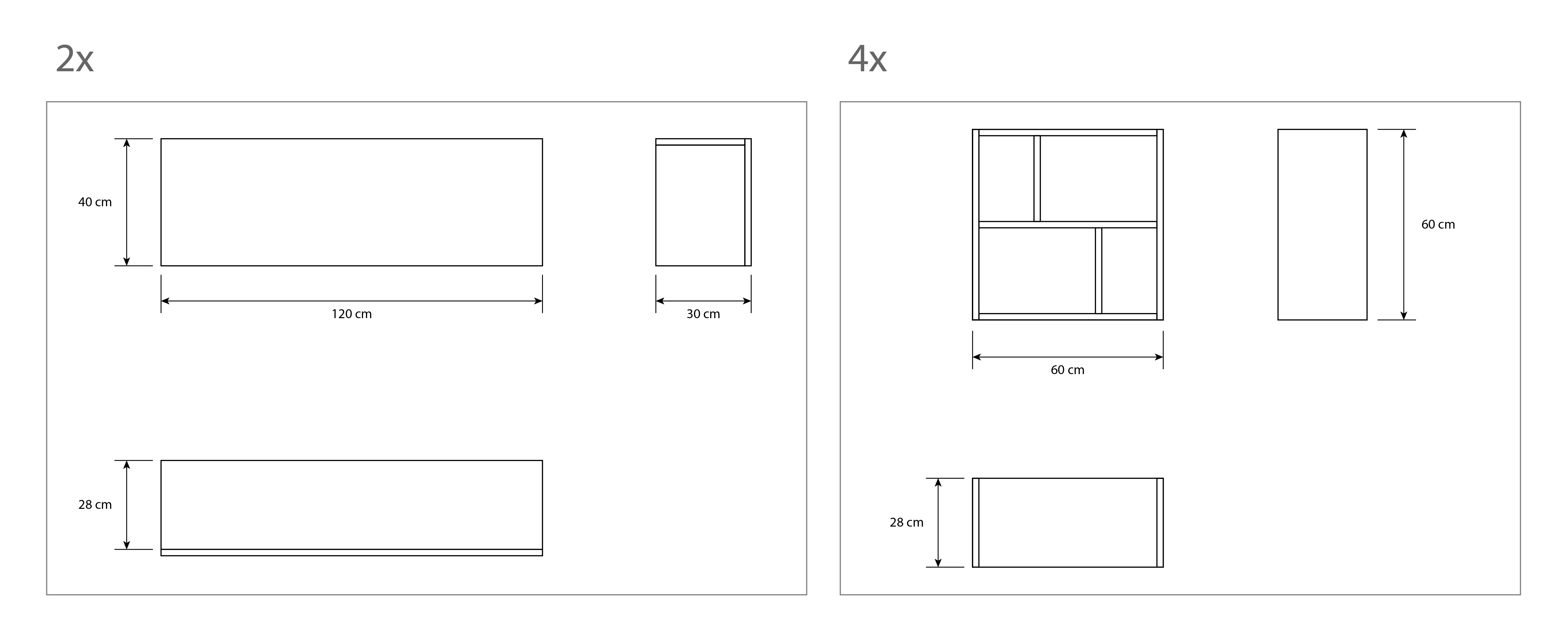 Ensemble composé de deux meubles à portes pliantes et de trois meubles décoratifs. Une infinité de combinaisons possibles avec tous les modules ou compositions de la collection CREA. Meubles en panneaux de particules laminés. Grande capacité de stockage à l'intérieur. Prêt à être accroché au mur avec la possibilité d'ajouter des pieds ou des roues. Il est livré démonté, facile à monter. Fabriqué en Espagne.