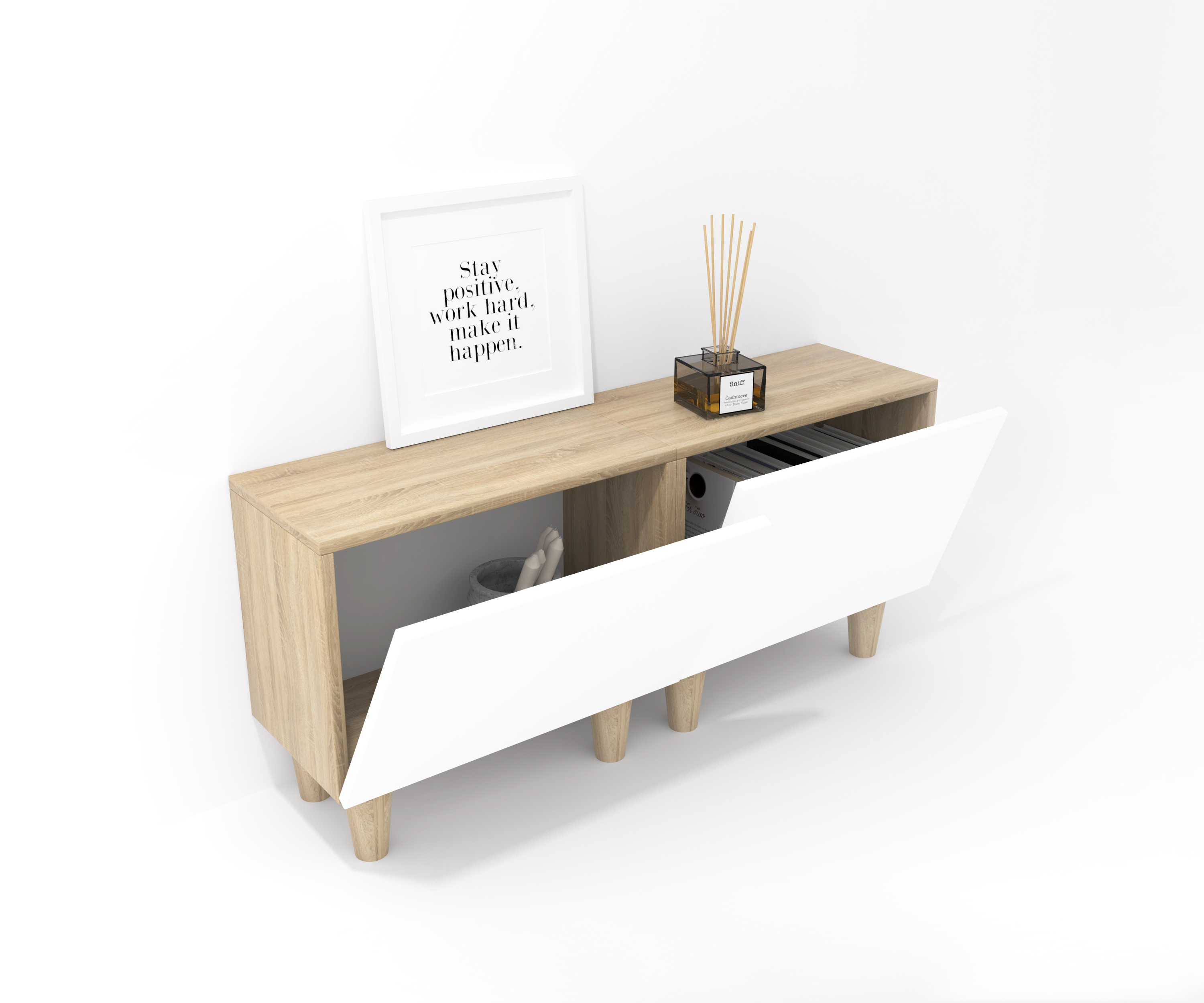 Meubles avec porte pliante, idéal pour se combiner avec tous les modules ou compositions de la collection CREA. Meubles en panneaux de particules laminés. Grande capacité de stockage à l'intérieur. Prêt à être accroché au mur avec la possibilité d'ajouter des pieds ou des roues. Il est livré démonté, facile à monter. Fabriqué en Espagne.