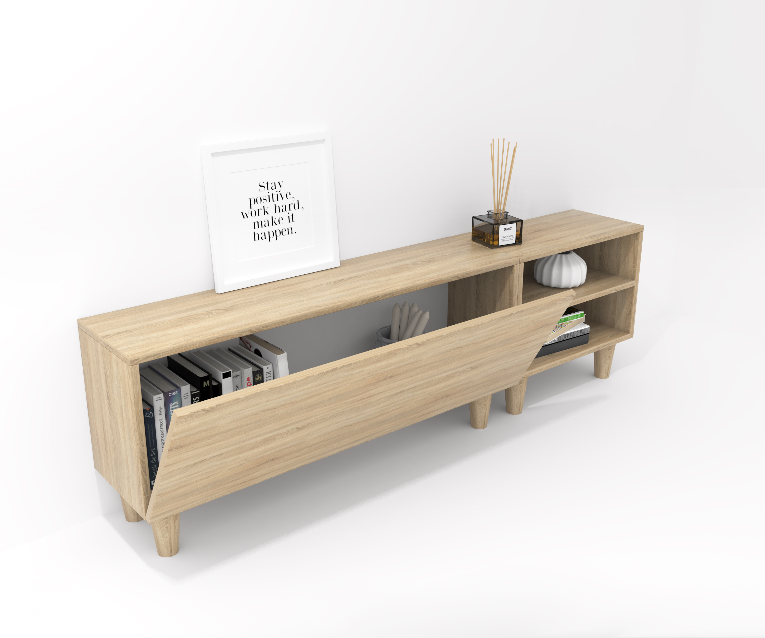 Ensemble composé d'une armoire avec une porte à charnières et d'un meuble décoratif. Une infinité de combinaisons possibles avec tous les modules ou compositions de la collection CREA. Meubles en panneaux de particules laminés. Grande capacité de stockage à l'intérieur. Prêt à être accroché au mur avec la possibilité d'ajouter des pieds ou des roues. Il est livré démonté, facile à monter. Fabriqué en Espagne.