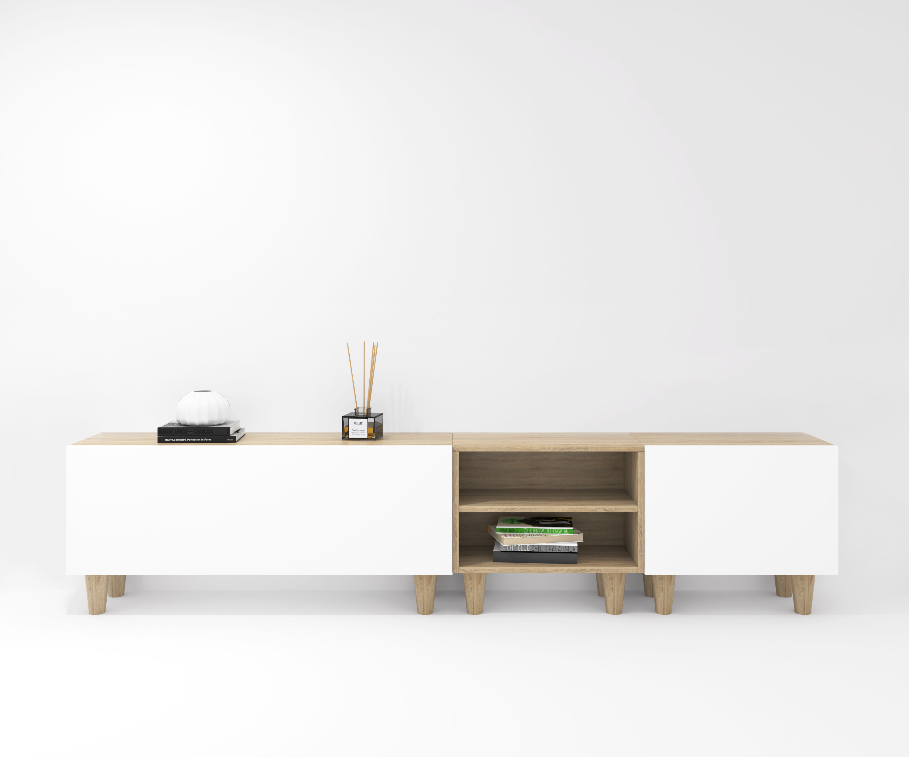 Ensemble composé de deux meubles à portes pliantes et d'un meuble décoratif. Une infinité de combinaisons possibles avec tous les modules ou compositions de la collection CREA. Meubles en panneaux de particules laminés. Grande capacité de stockage à l'intérieur. Prêt à être accroché au mur avec la possibilité d'ajouter des pieds ou des roues. Il est livré démonté, facile à monter. Fabriqué en Espagne.