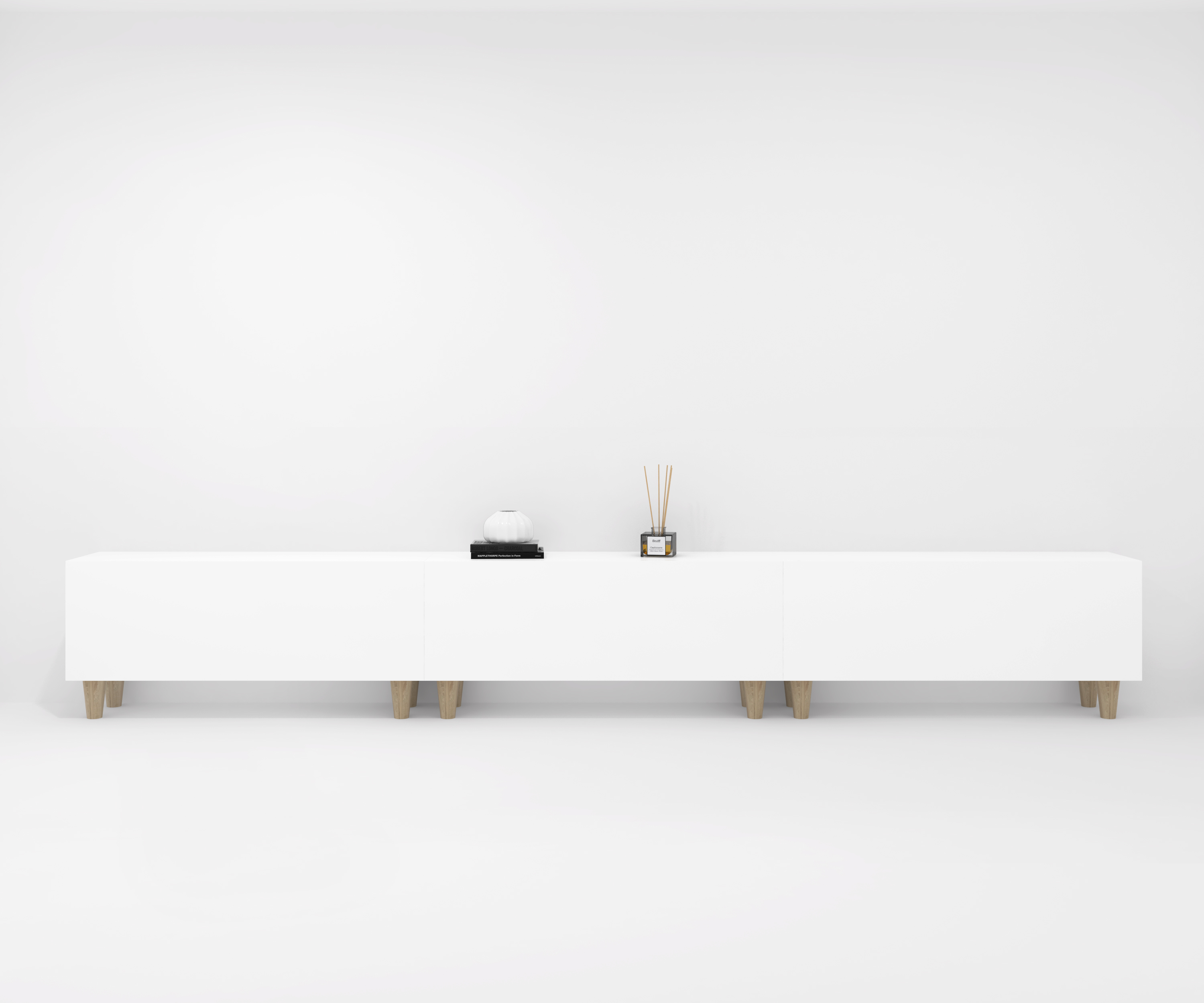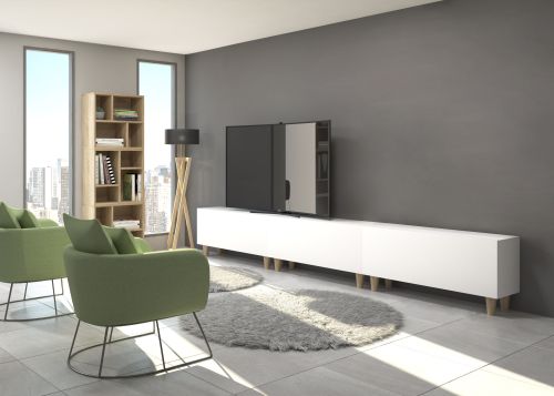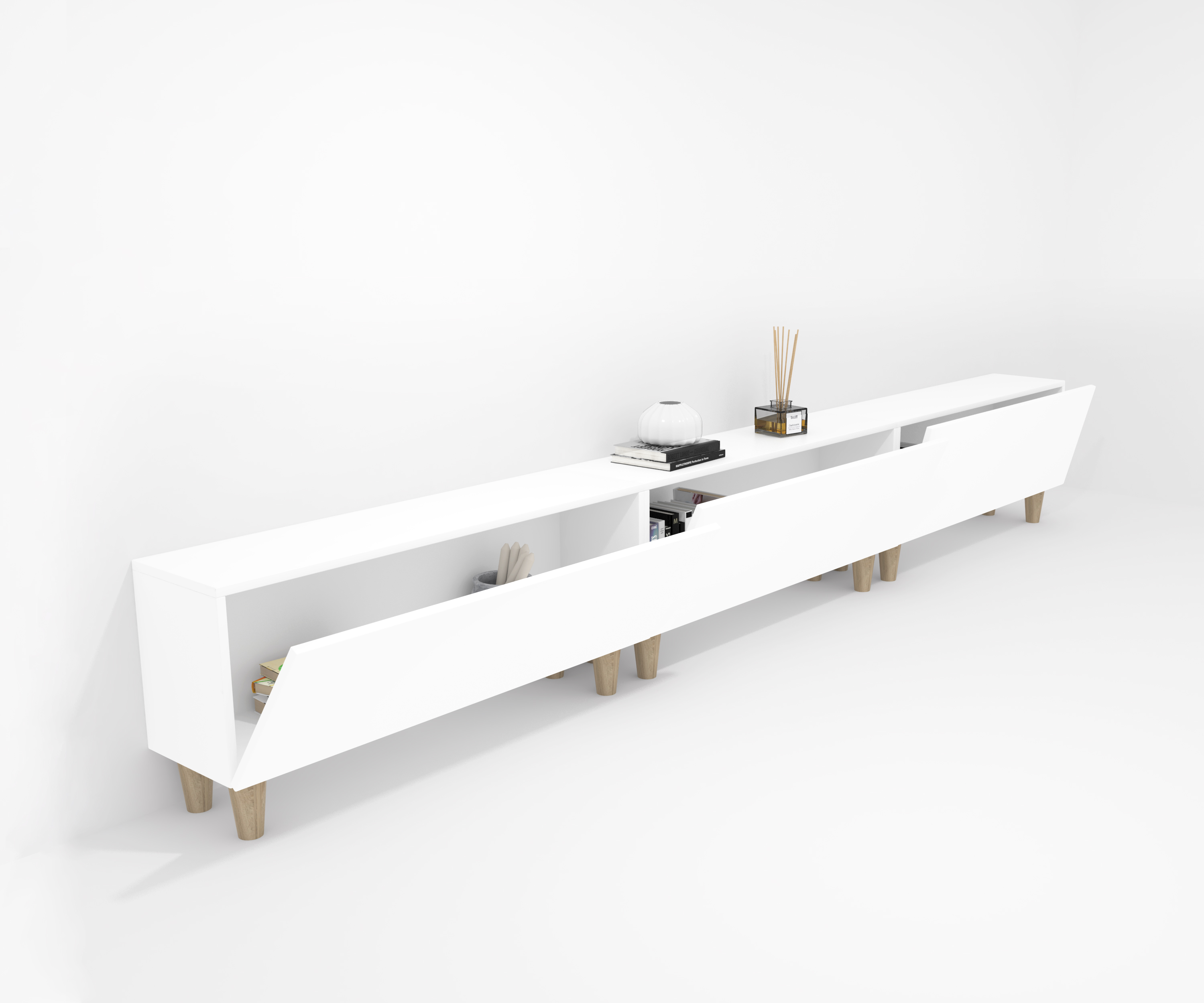 Ensemble composé de trois meubles avec une porte pliante. Une infinité de combinaisons possibles avec tous les modules ou compositions de la collection CREA. Meubles en panneaux de particules laminés. Grande capacité de stockage à l'intérieur. Prêt à être accroché au mur avec la possibilité d'ajouter des pieds ou des roues. Il est livré démonté, facile à monter. Fabriqué en Espagne.