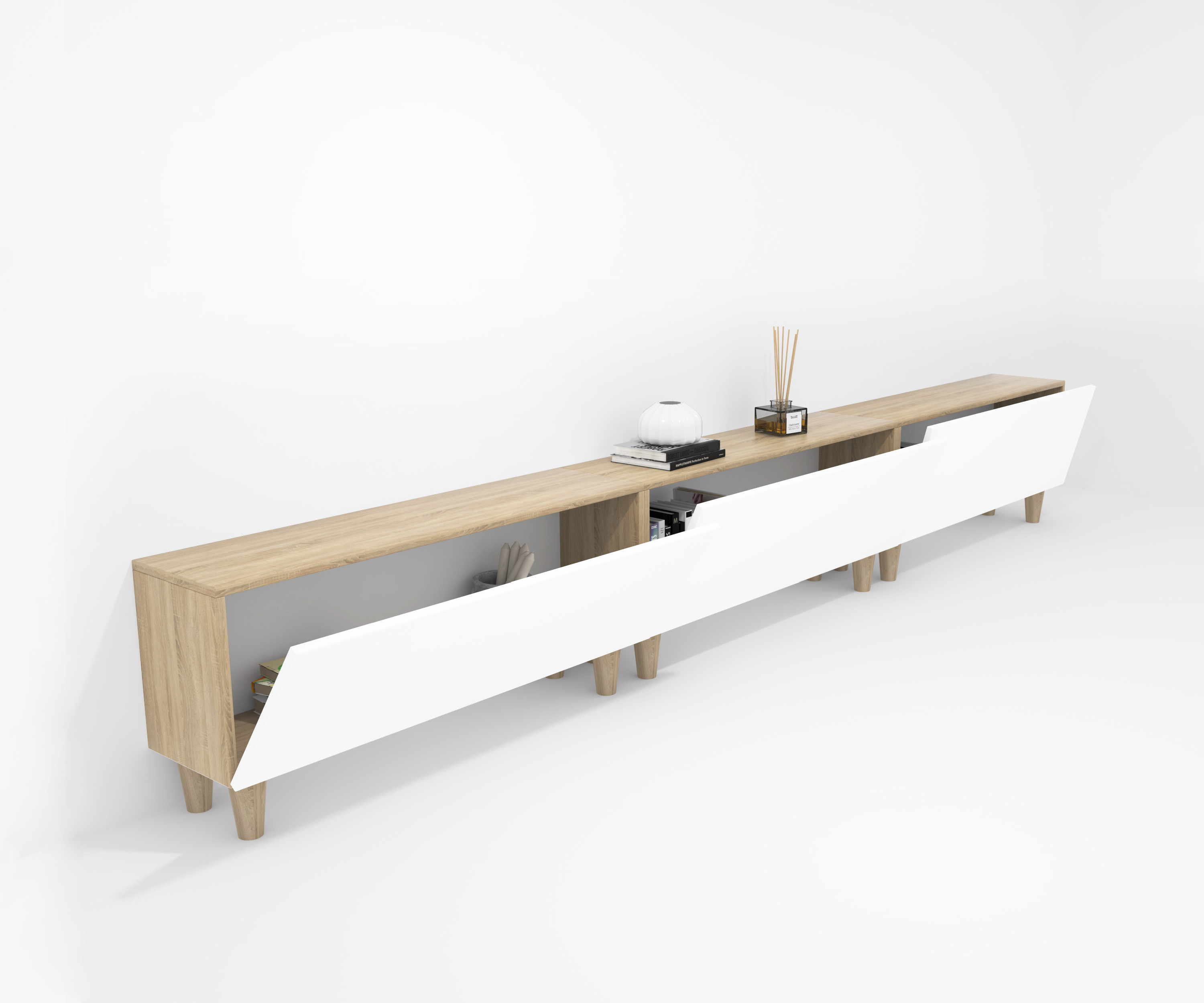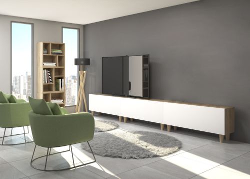 Ensemble composé de trois meubles avec une porte pliante. Une infinité de combinaisons possibles avec tous les modules ou compositions de la collection CREA. Meubles en panneaux de particules laminés. Grande capacité de stockage à l'intérieur. Prêt à être accroché au mur avec la possibilité d'ajouter des pieds ou des roues. Il est livré démonté, facile à monter. Fabriqué en Espagne.