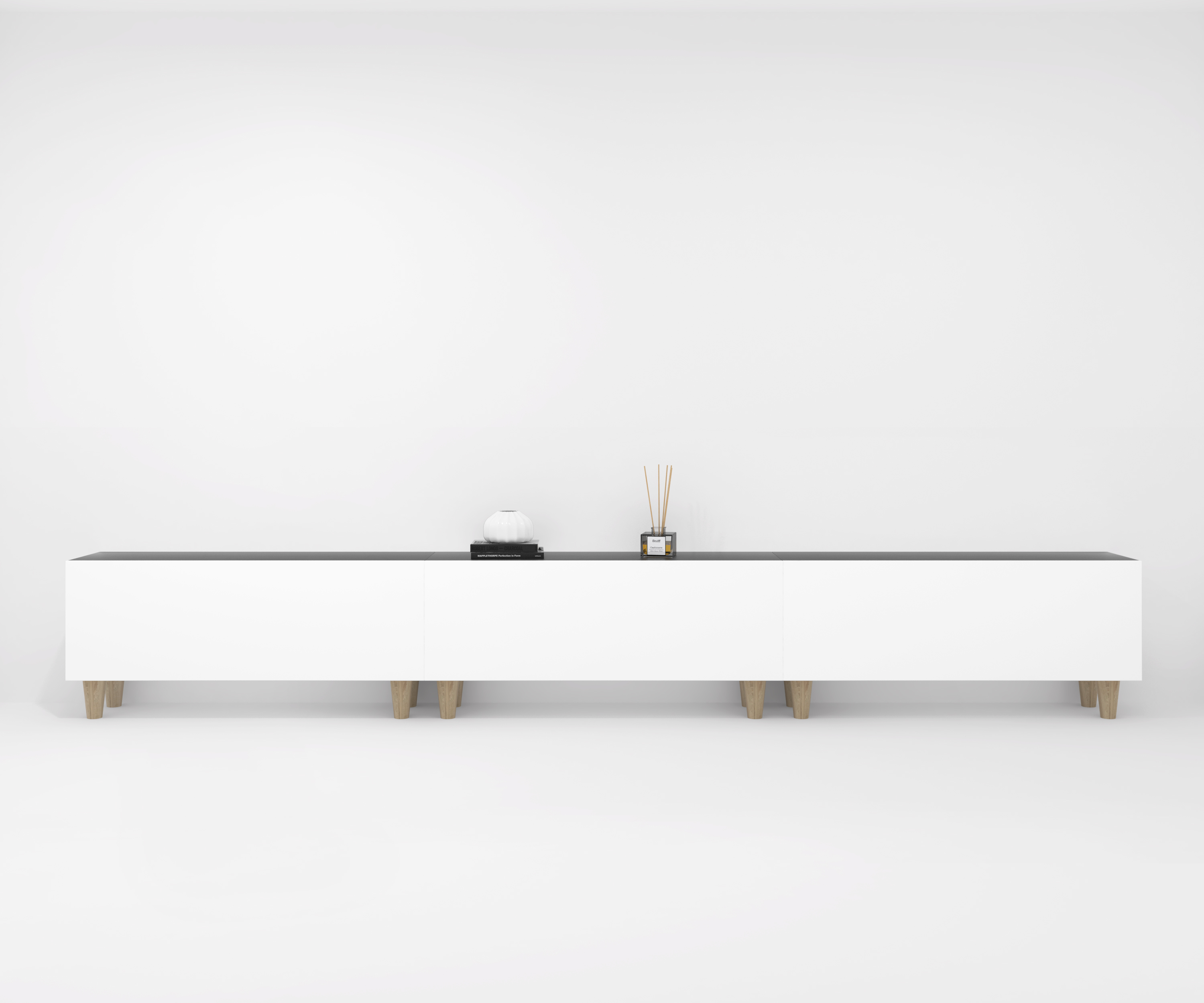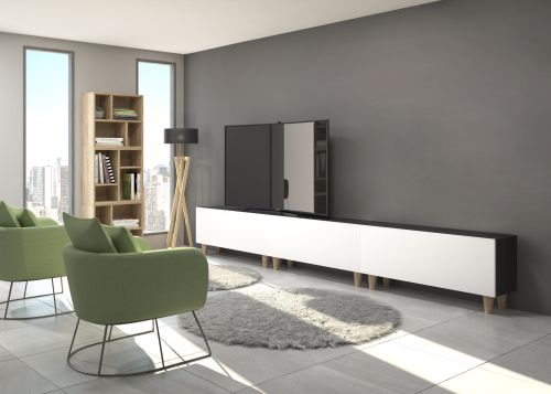 Ensemble composé de trois meubles avec une porte pliante. Une infinité de combinaisons possibles avec tous les modules ou compositions de la collection CREA. Meubles en panneaux de particules laminés. Grande capacité de stockage à l'intérieur. Prêt à être accroché au mur avec la possibilité d'ajouter des pieds ou des roues. Il est livré démonté, facile à monter. Fabriqué en Espagne.