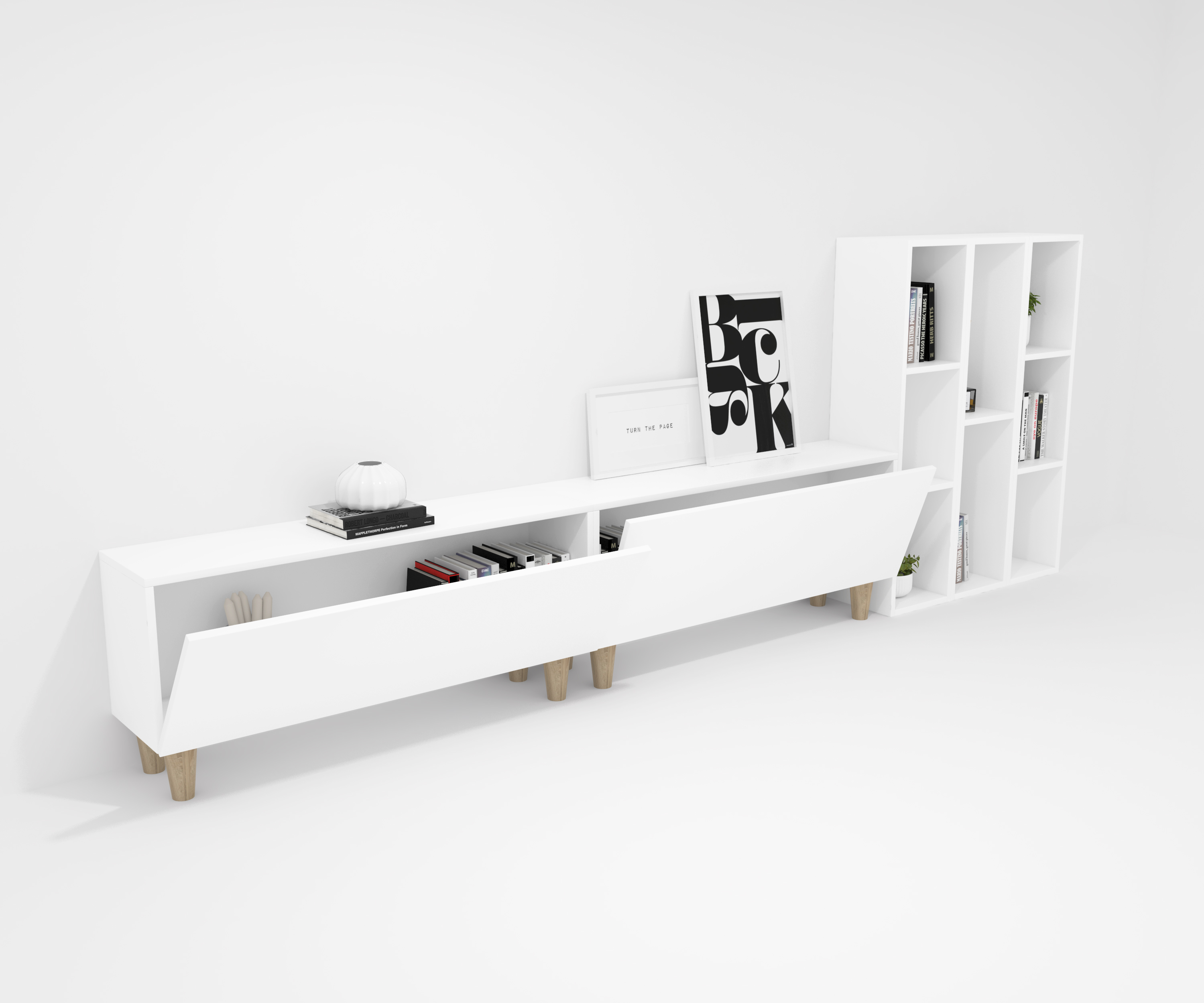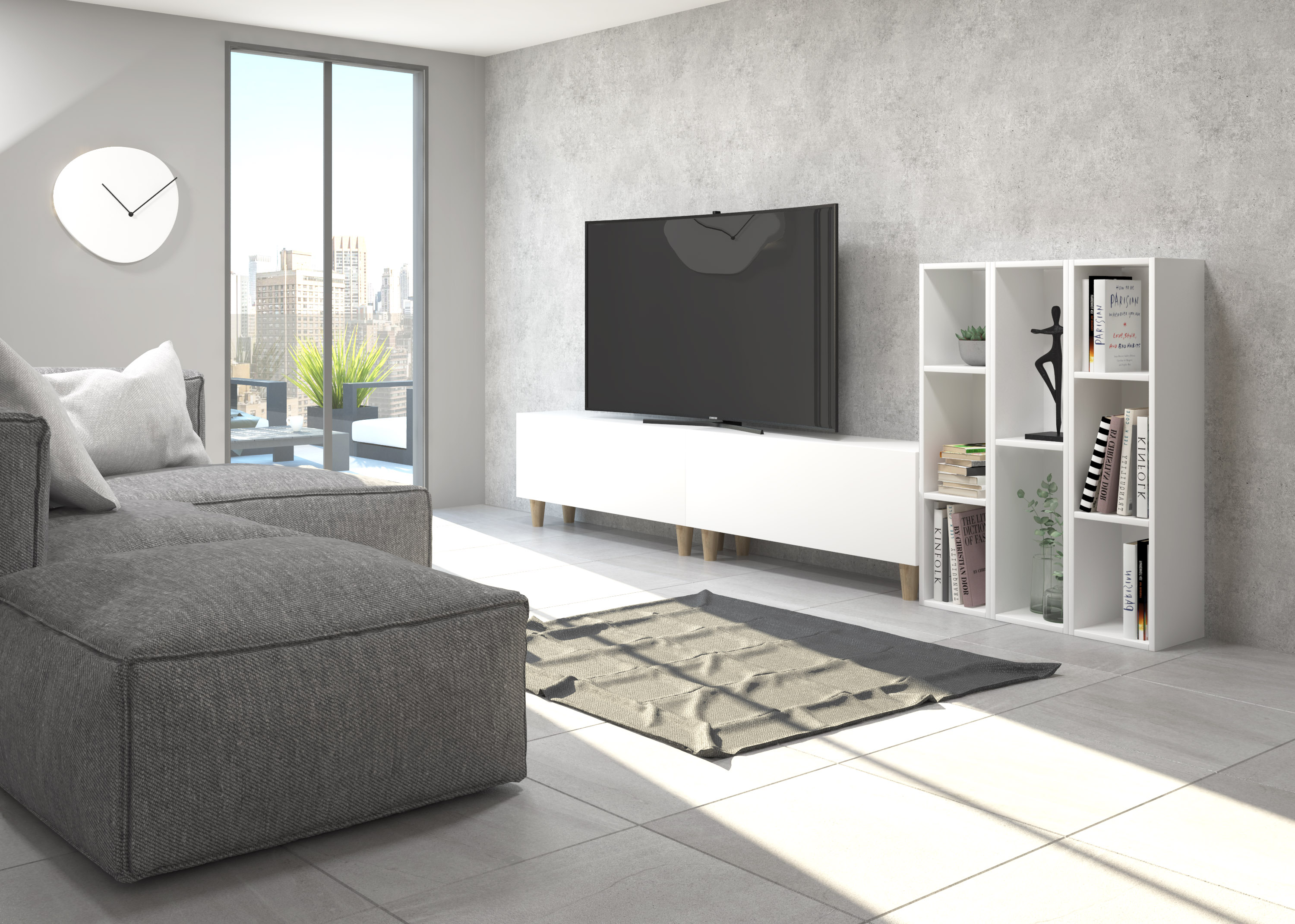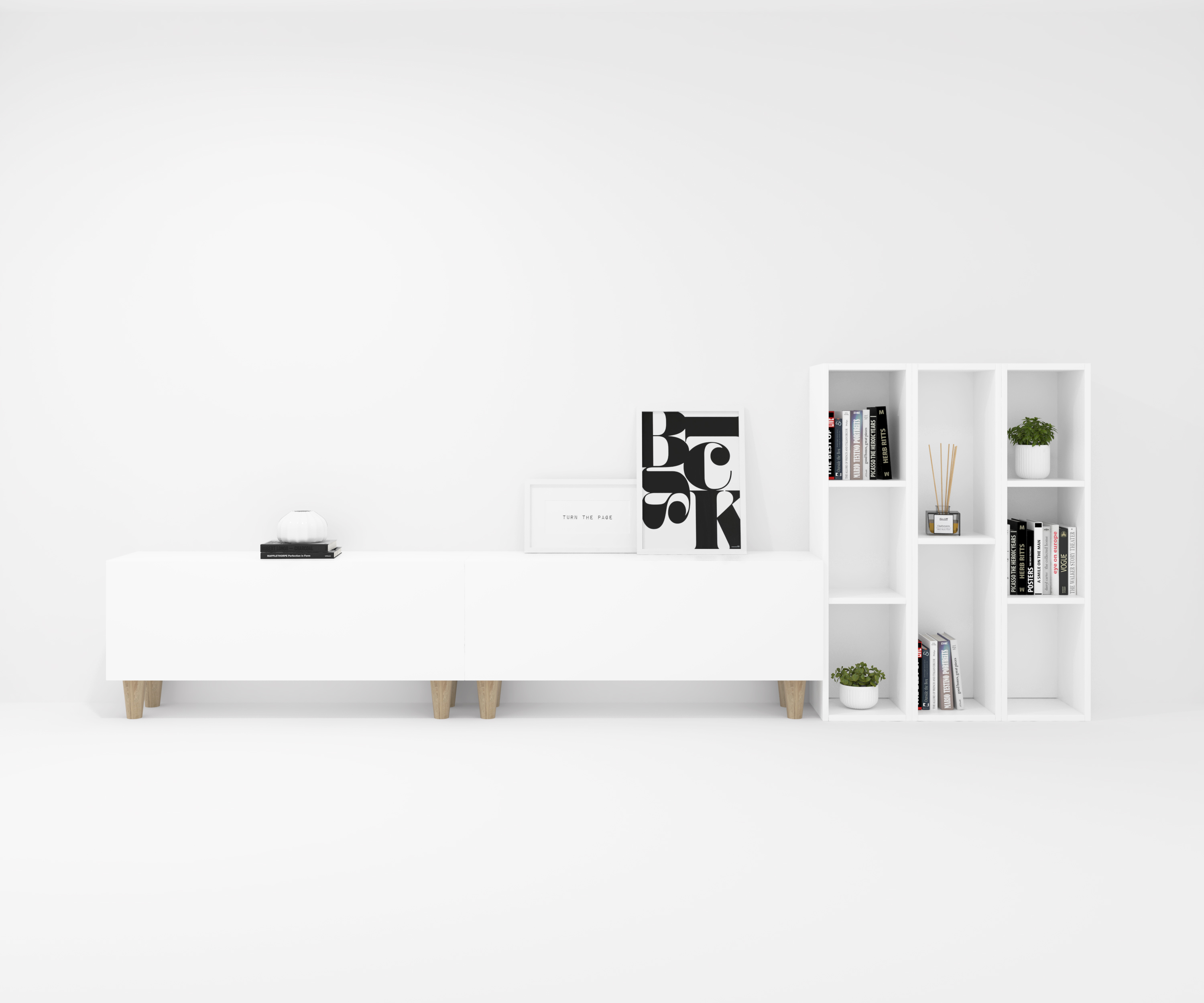 Ensemble composé de deux meubles à portes pliantes et de trois meubles décoratifs. Une infinité de combinaisons possibles avec tous les modules ou compositions de la collection CREA. Meubles en panneaux de particules laminés. Grande capacité de stockage à l'intérieur. Prêt à être accroché au mur avec la possibilité d'ajouter des pieds ou des roues. Il est livré démonté, facile à monter. Fabriqué en Espagne.