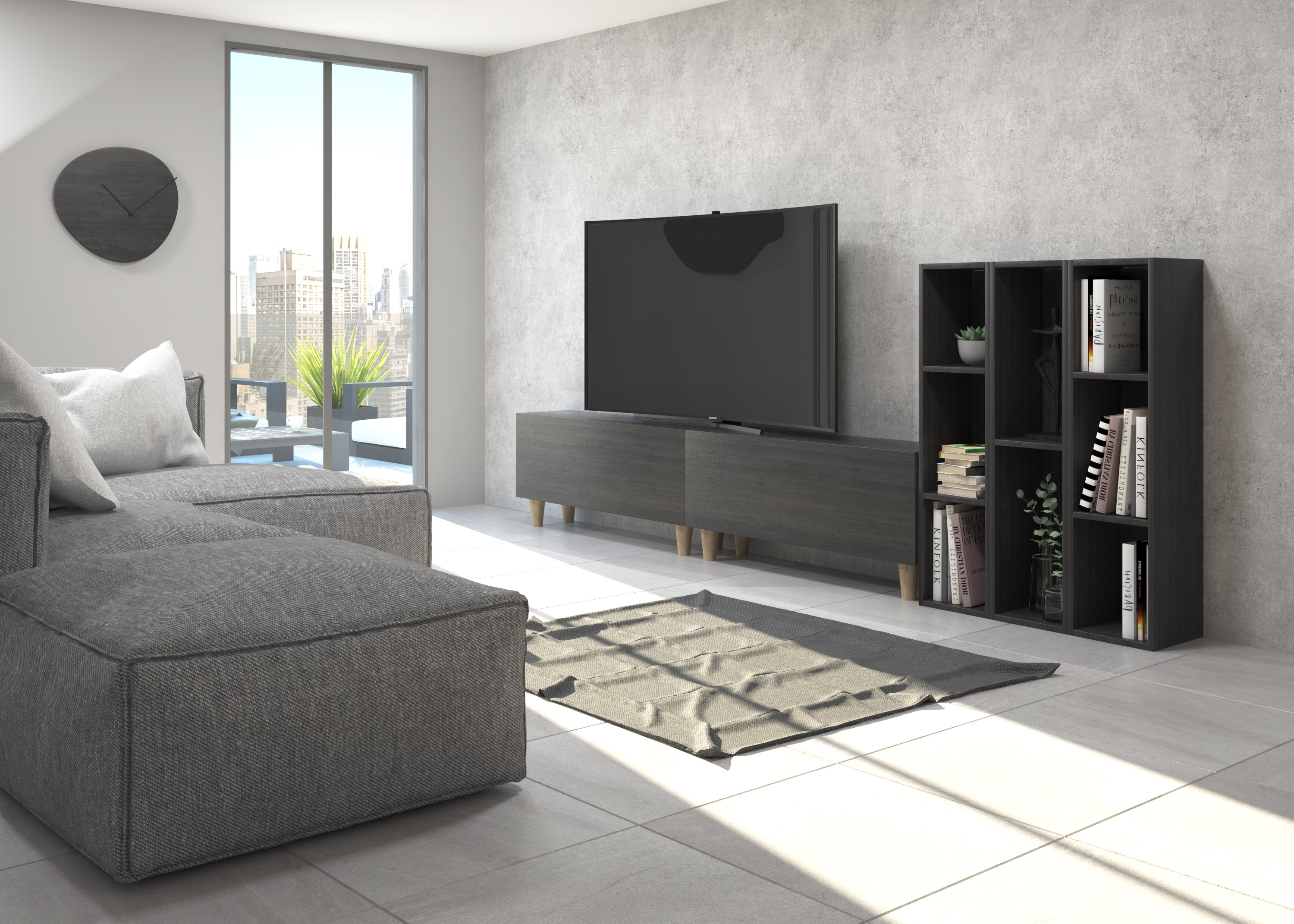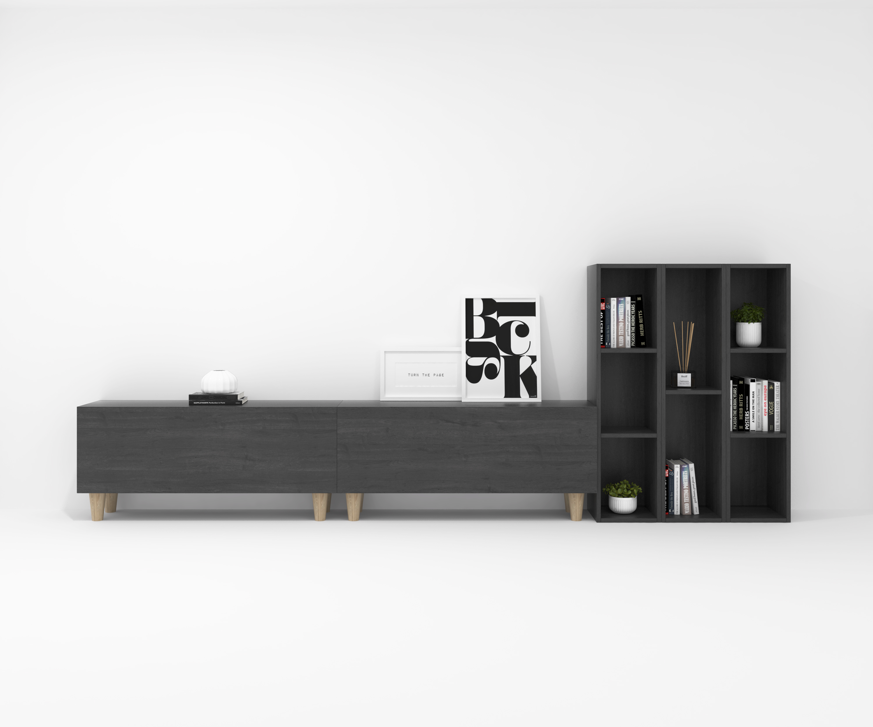 Ensemble composé de deux meubles à portes pliantes et de trois meubles décoratifs. Une infinité de combinaisons possibles avec tous les modules ou compositions de la collection CREA. Meubles en panneaux de particules laminés. Grande capacité de stockage à l'intérieur. Prêt à être accroché au mur avec la possibilité d'ajouter des pieds ou des roues. Il est livré démonté, facile à monter. Fabriqué en Espagne.