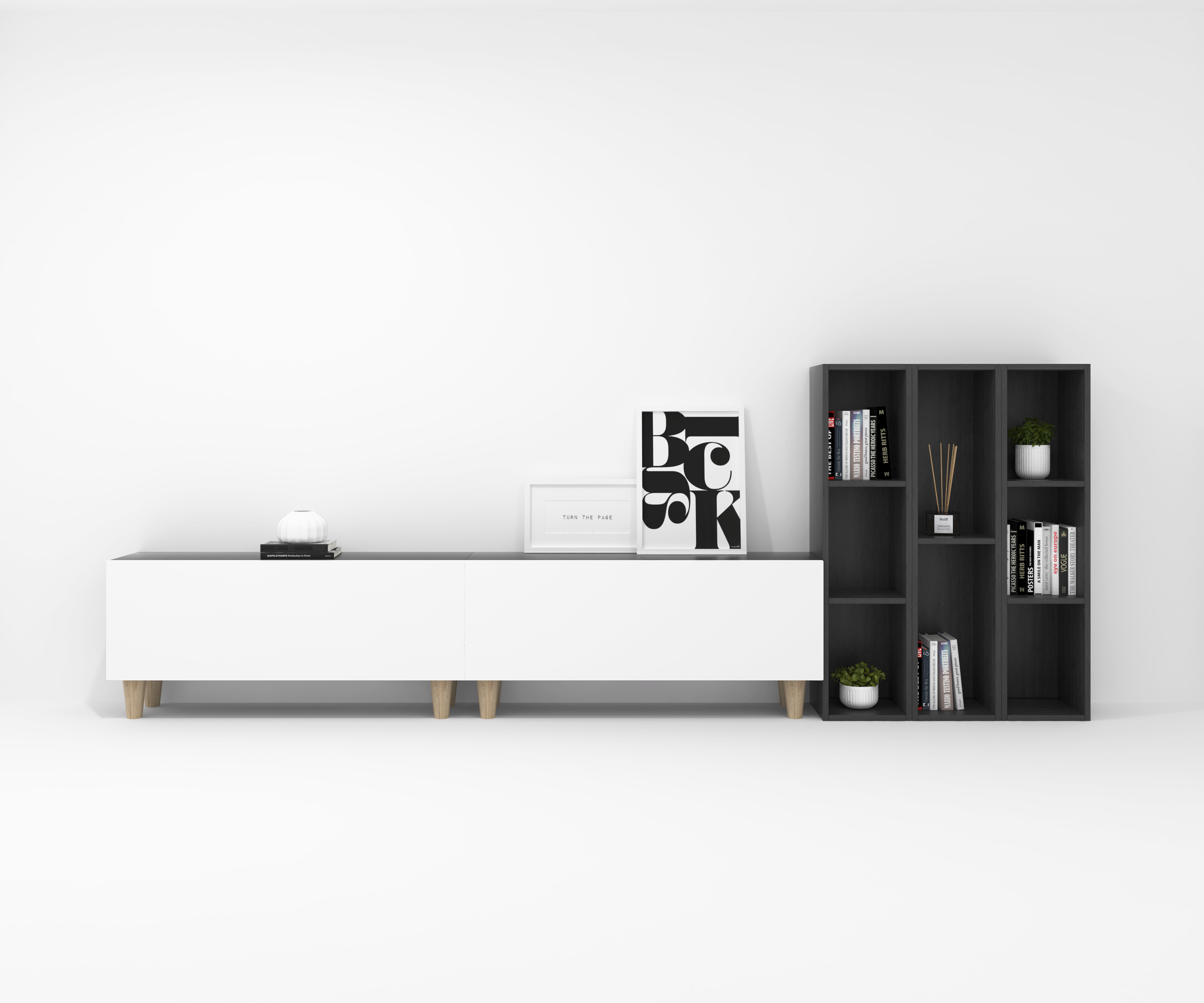 Ensemble composé de deux meubles à portes pliantes et de trois meubles décoratifs. Une infinité de combinaisons possibles avec tous les modules ou compositions de la collection CREA. Meubles en panneaux de particules laminés. Grande capacité de stockage à l'intérieur. Prêt à être accroché au mur avec la possibilité d'ajouter des pieds ou des roues. Il est livré démonté, facile à monter. Fabriqué en Espagne.