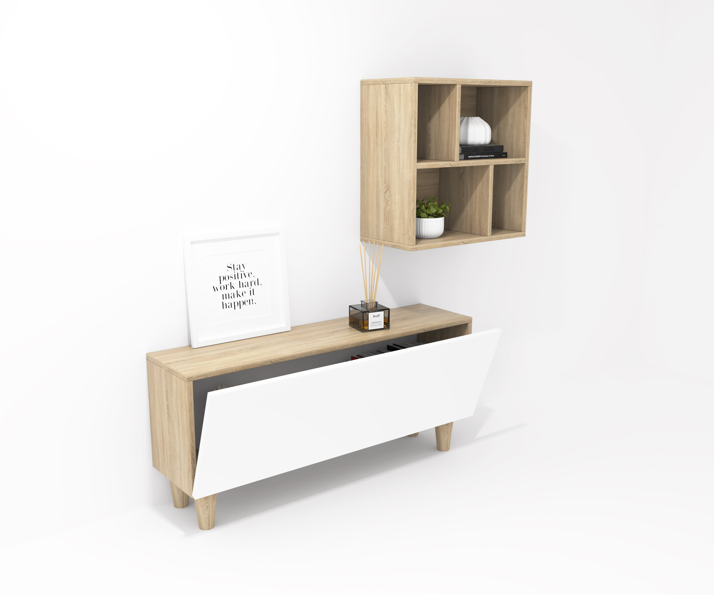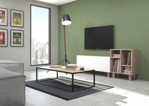 Ensemble composé d'une armoire avec une porte à charnières et d'un meuble décoratif. Une infinité de combinaisons possibles avec tous les modules ou compositions de la collection CREA. Meubles en panneaux de particules laminés. Grande capacité de stockage à l'intérieur. Prêt à être accroché au mur avec la possibilité d'ajouter des pieds ou des roues. Il est livré démonté, facile à monter. Fabriqué en Espagne.