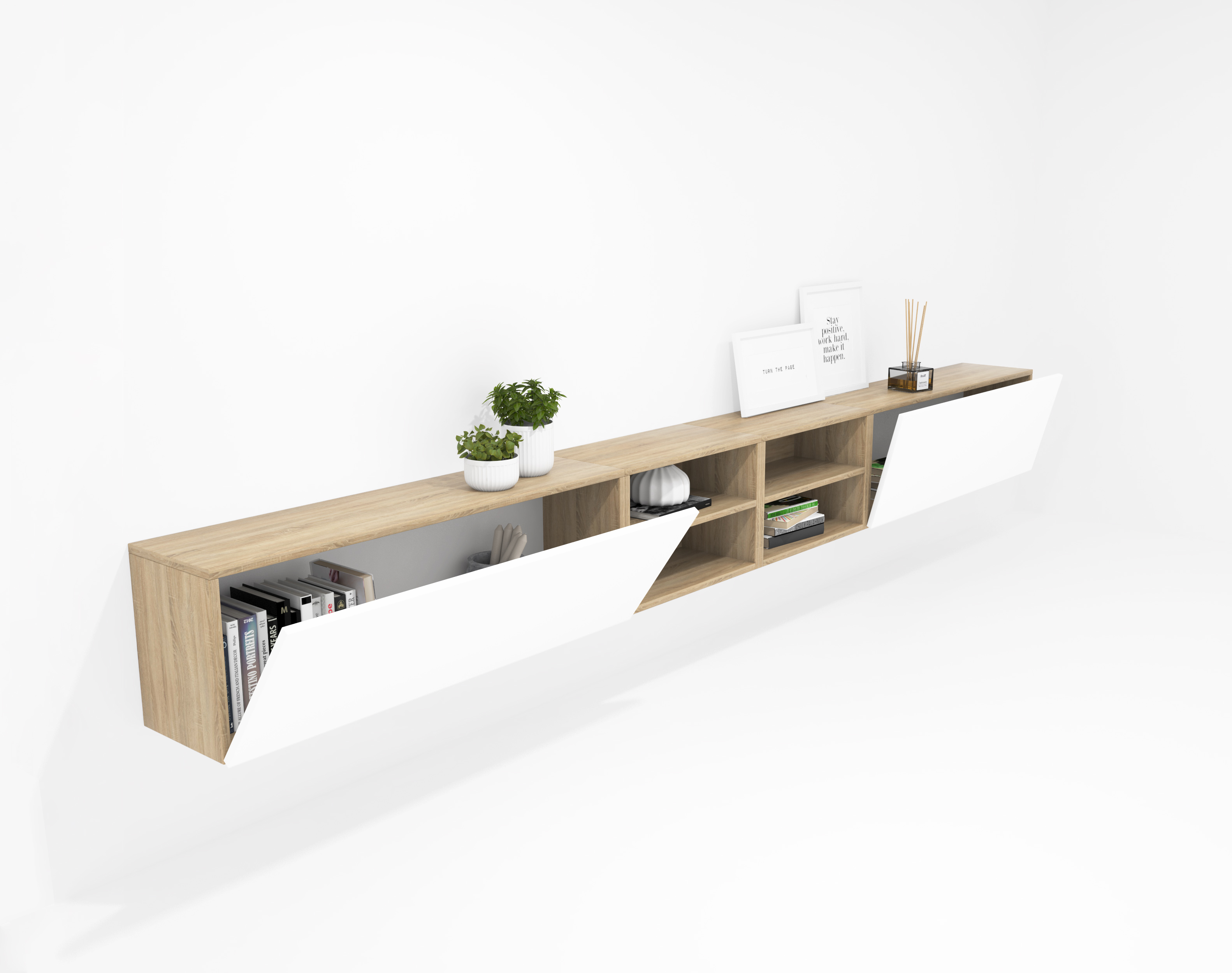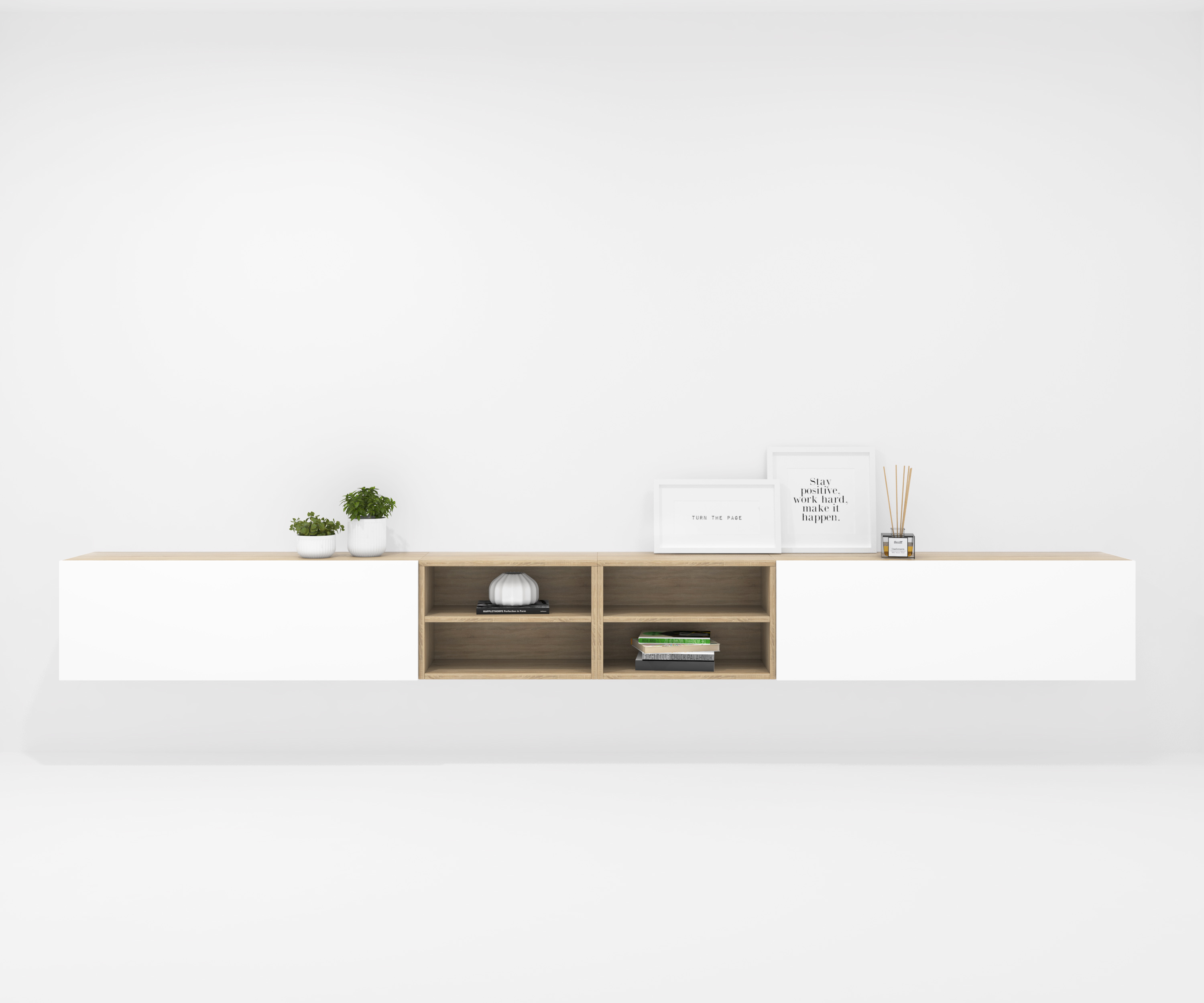 Pack formado por dos muebles con puerta abatible y dos muebles decorativos. Infinidad de combinaciones posibles con todos los módulos o composiciones de la colección CREA. Mueble fabricado en tablero laminado de partículas . Gran capacidad de almacenaje interior. Preparado para ser colgado en la pared con posibilidad de añadir patas o ruedas. Se entrega desmontado, fácil montaje. Fabricado en España.