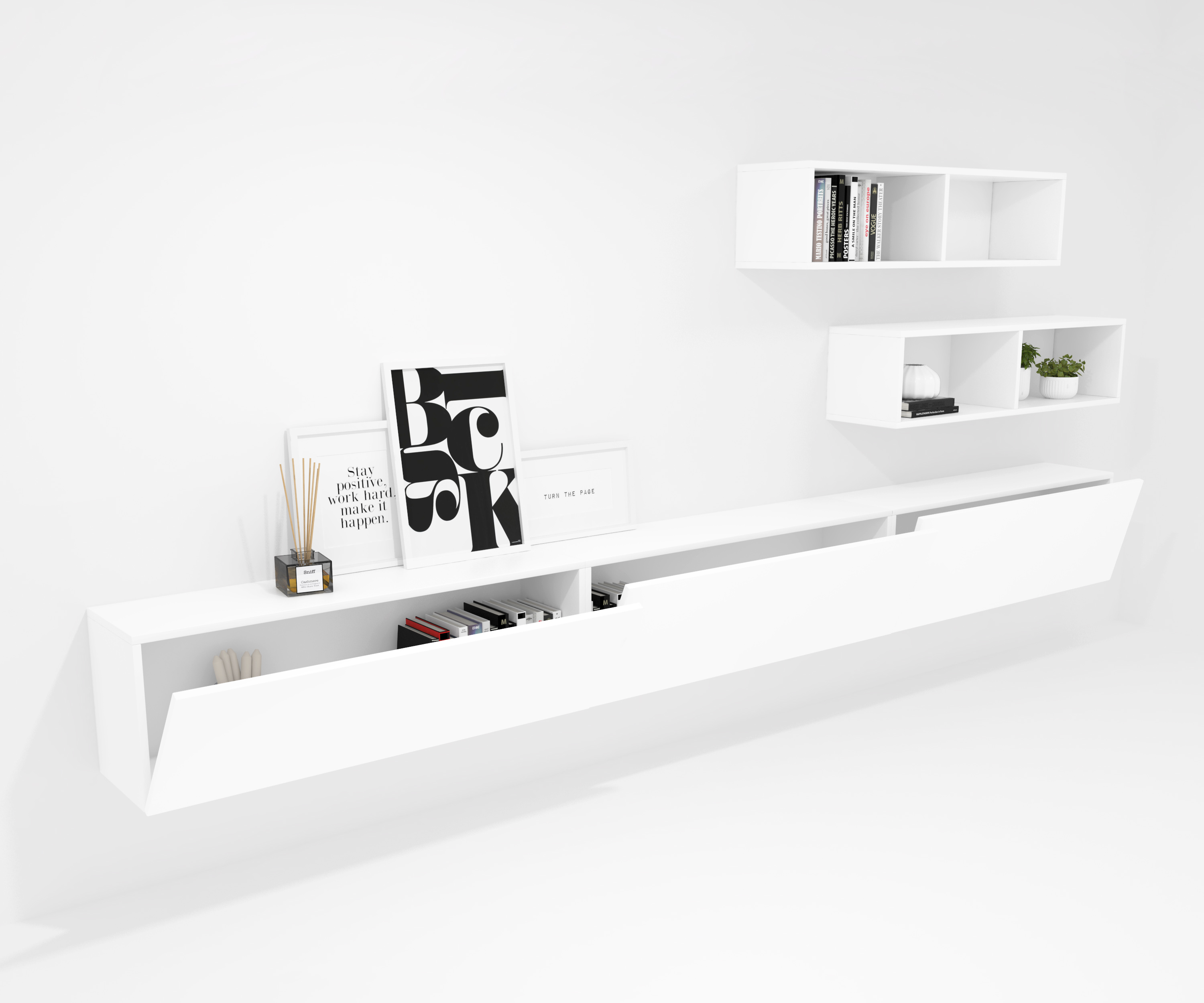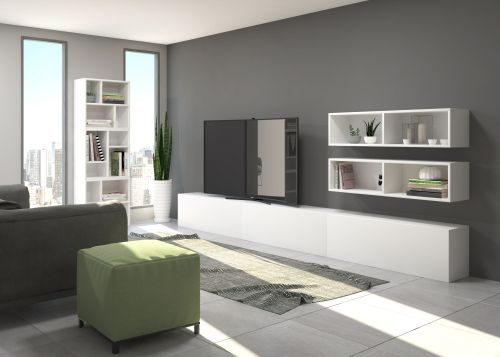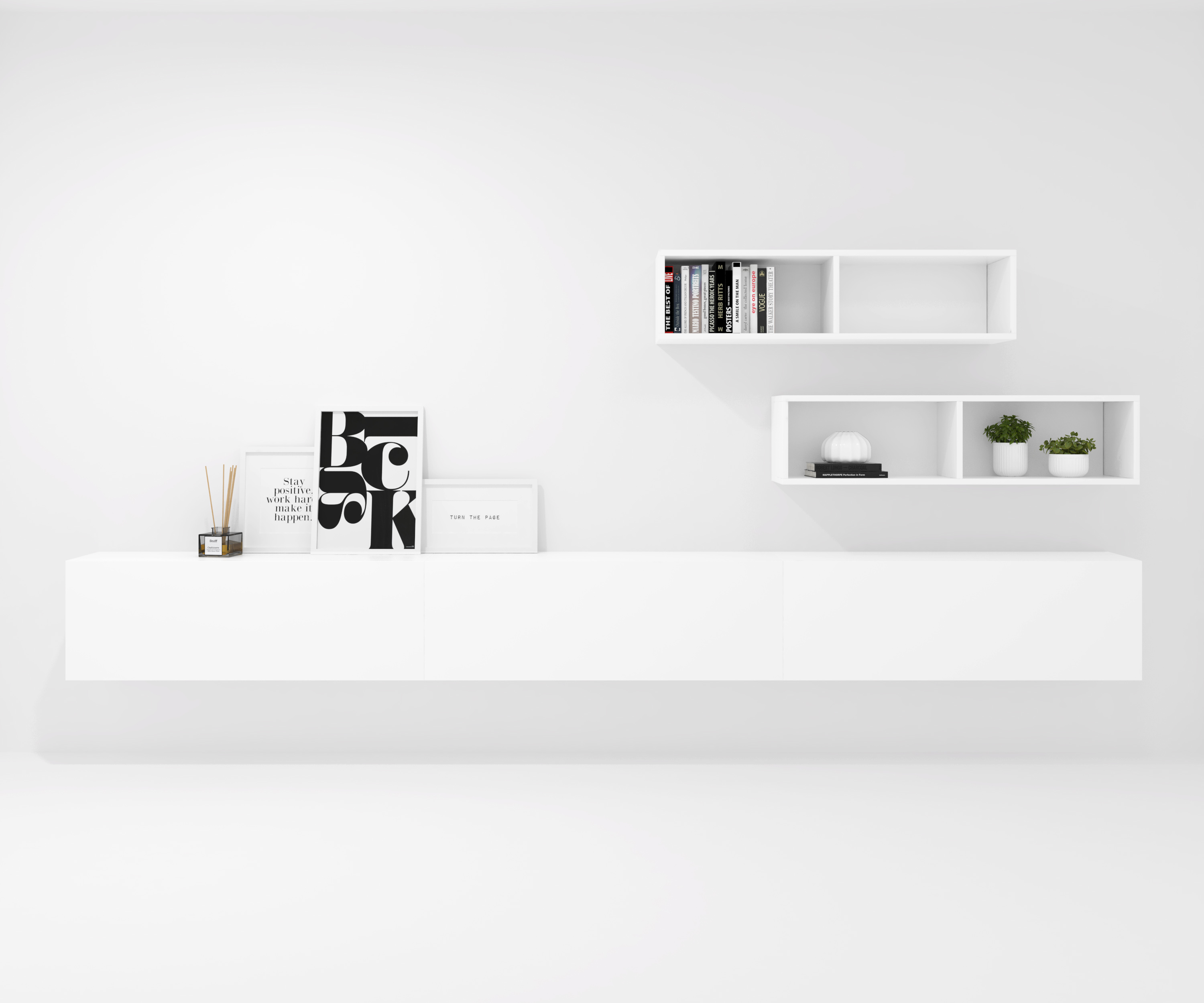 Pack formado por tres muebles con puerta abatible y dos muebles decorativos. Infinidad de combinaciones posibles con todos los módulos o composiciones de la colección CREA. Mueble fabricado en tablero laminado de partículas . Gran capacidad de almacenaje interior. Preparado para ser colgado en la pared con posibilidad de añadir patas o ruedas. Se entrega desmontado, fácil montaje. Fabricado en España.