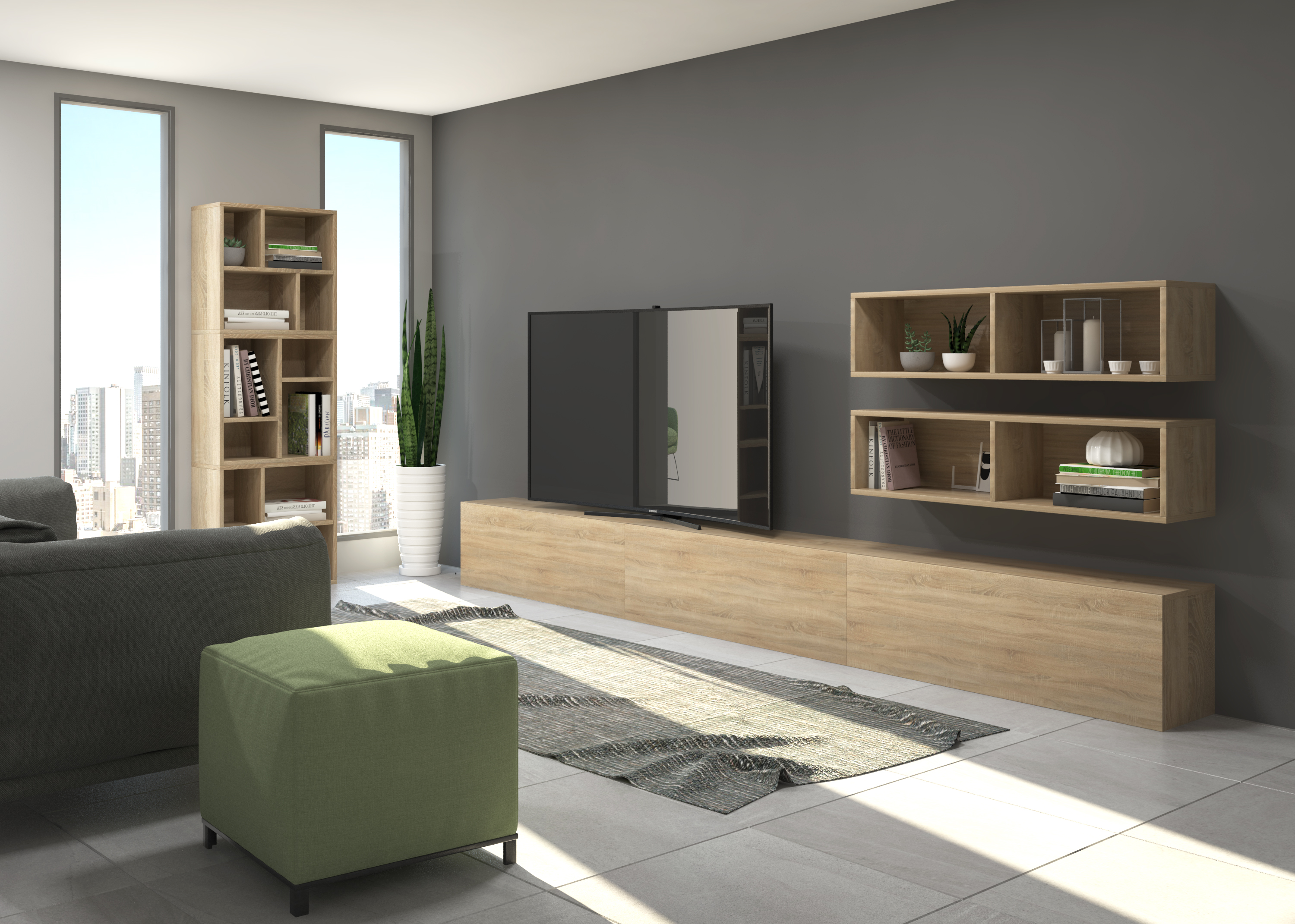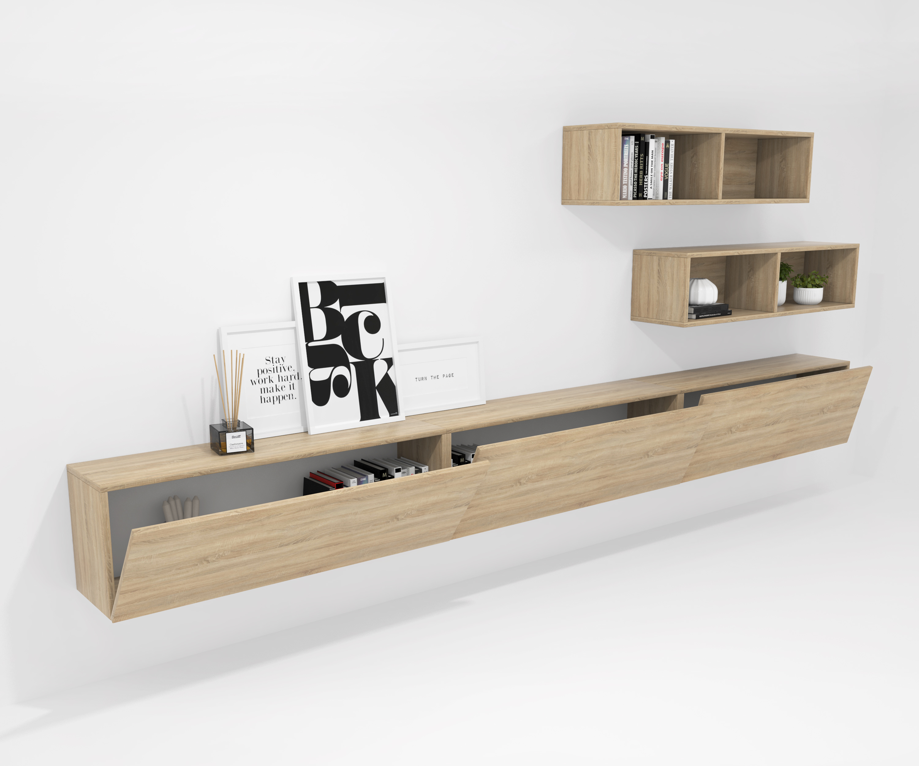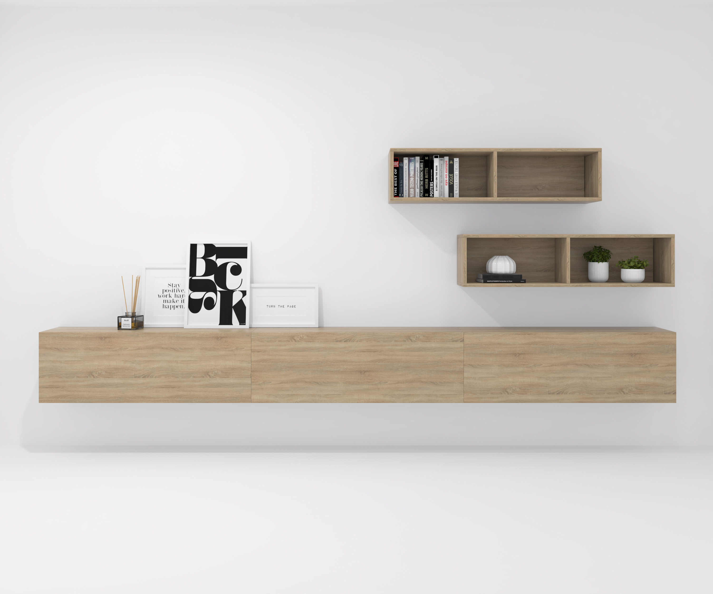 Pack formado por tres muebles con puerta abatible y dos muebles decorativos. Infinidad de combinaciones posibles con todos los módulos o composiciones de la colección CREA. Mueble fabricado en tablero laminado de partículas . Gran capacidad de almacenaje interior. Preparado para ser colgado en la pared con posibilidad de añadir patas o ruedas. Se entrega desmontado, fácil montaje. Fabricado en España.