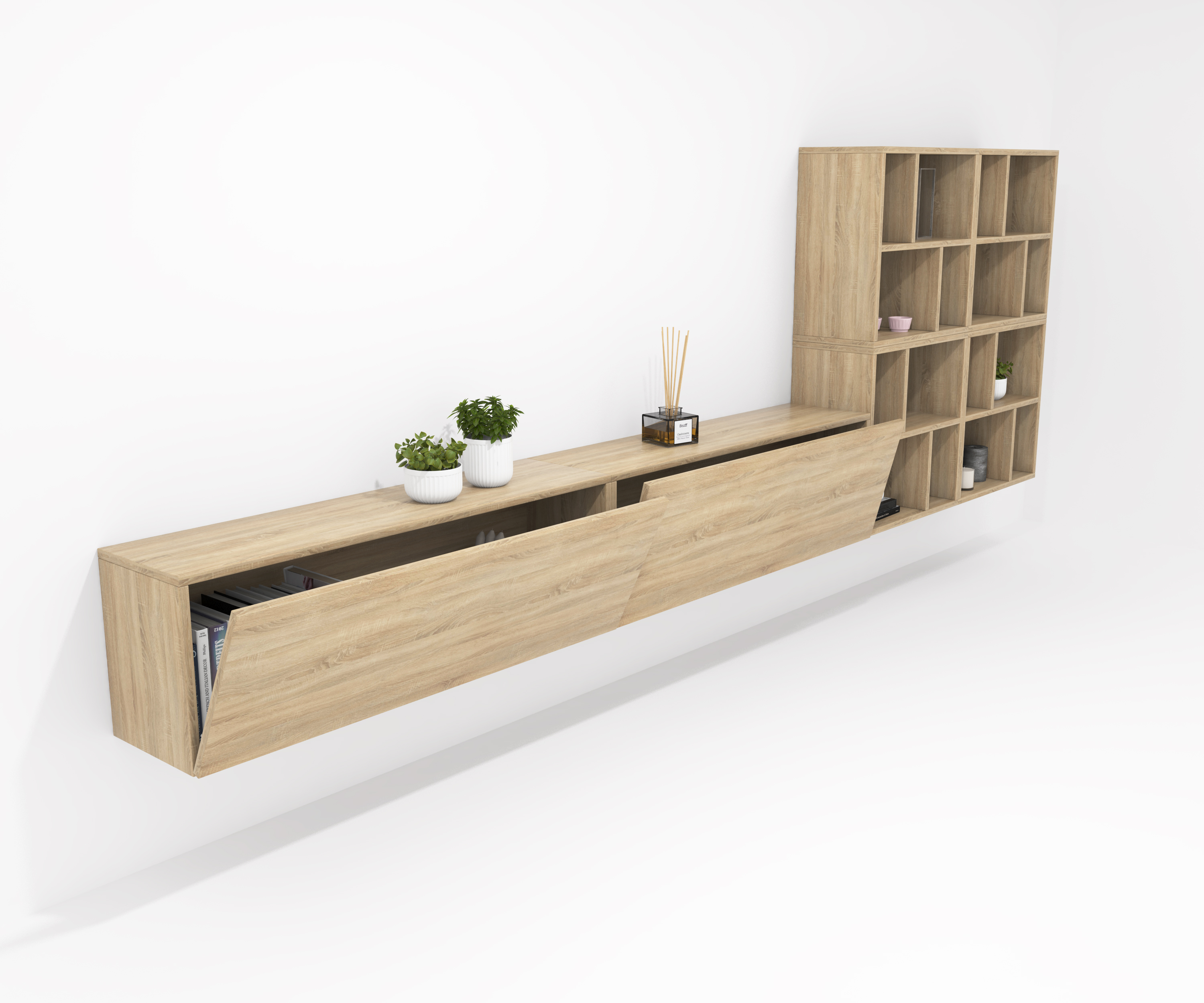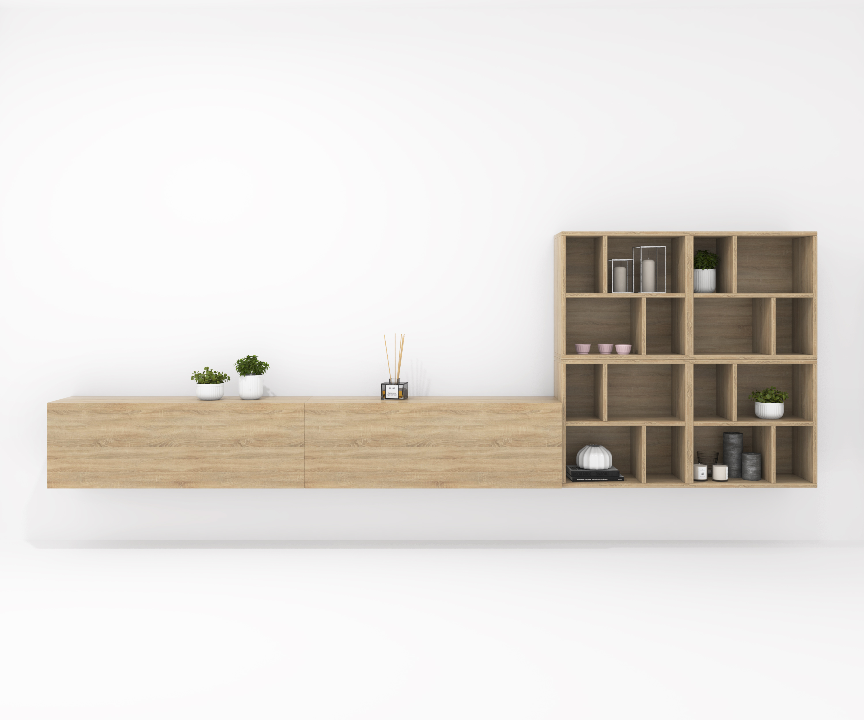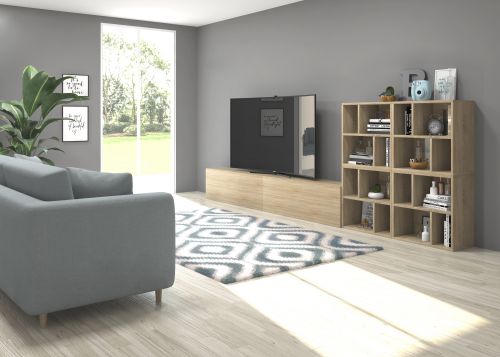 Pack formado por dos muebles con puerta abatible y tres muebles decorativos. Infinidad de combinaciones posibles con todos los módulos o composiciones de la colección CREA. Mueble fabricado en tablero laminado de partículas . Gran capacidad de almacenaje interior. Preparado para ser colgado en la pared con posibilidad de añadir patas o ruedas. Se entrega desmontado, fácil montaje. Fabricado en España.