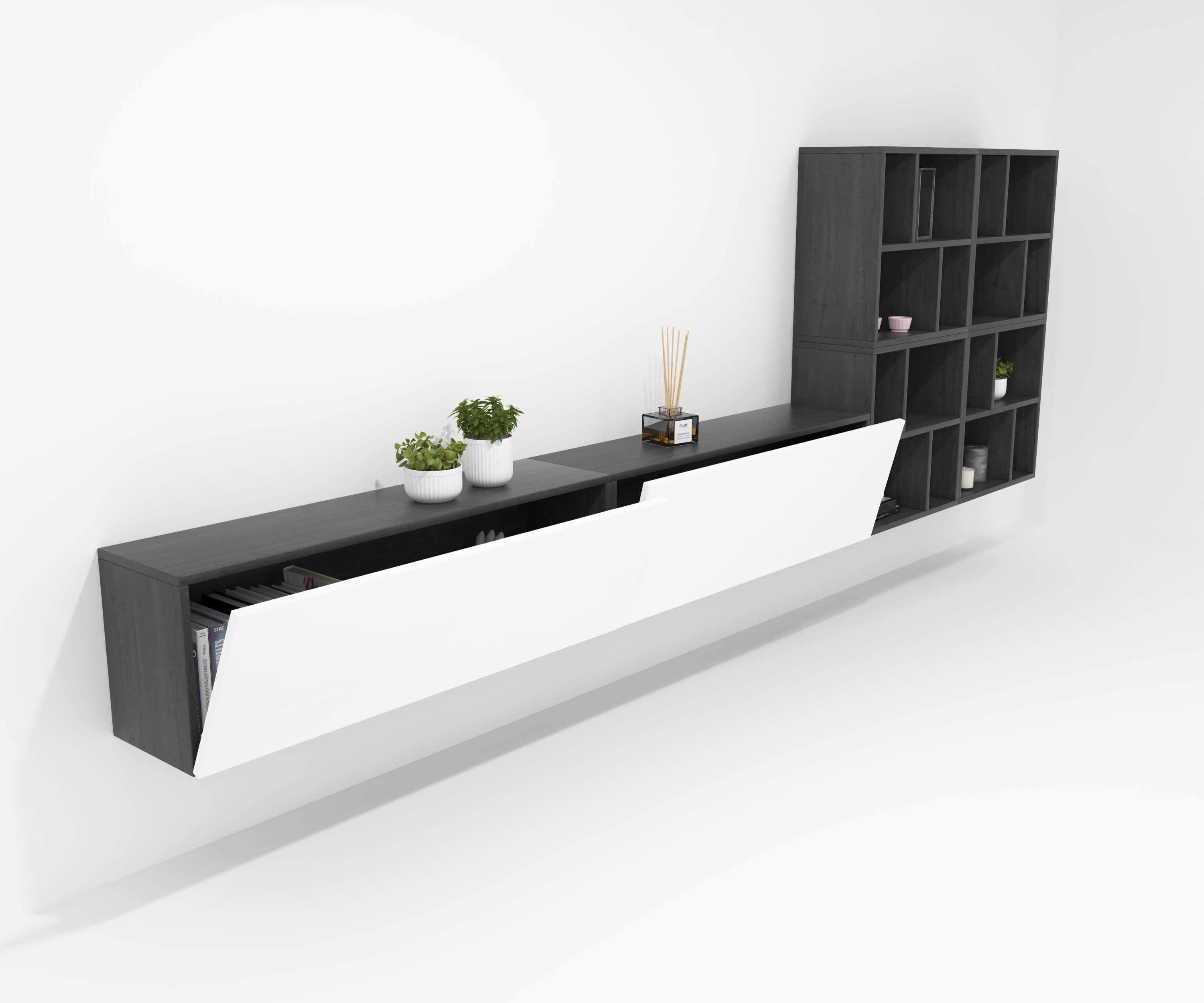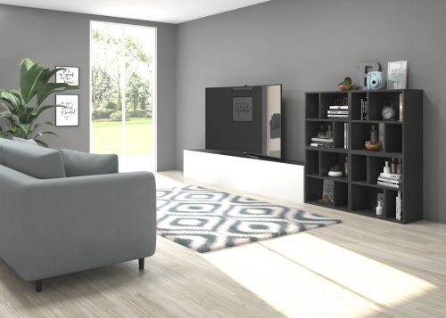 Pack formado por dos muebles con puerta abatible y tres muebles decorativos. Infinidad de combinaciones posibles con todos los módulos o composiciones de la colección CREA. Mueble fabricado en tablero laminado de partículas . Gran capacidad de almacenaje interior. Preparado para ser colgado en la pared con posibilidad de añadir patas o ruedas. Se entrega desmontado, fácil montaje. Fabricado en España.