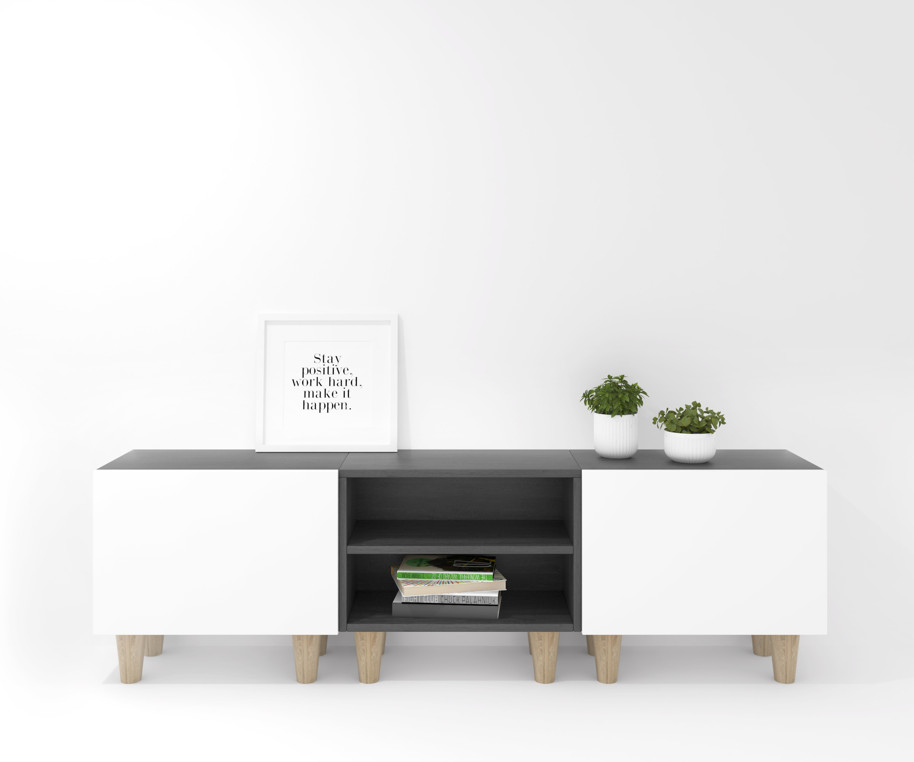 Pack formado por dos muebles con puerta abatible y un mueble decorativo. Infinidad de combinaciones posibles con todos los módulos o composiciones de la colección CREA. Mueble fabricado en tablero laminado de partículas . Gran capacidad de almacenaje interior. Preparado para ser colgado en la pared con posibilidad de añadir patas o ruedas. Se entrega desmontado, fácil montaje. Fabricado en España.