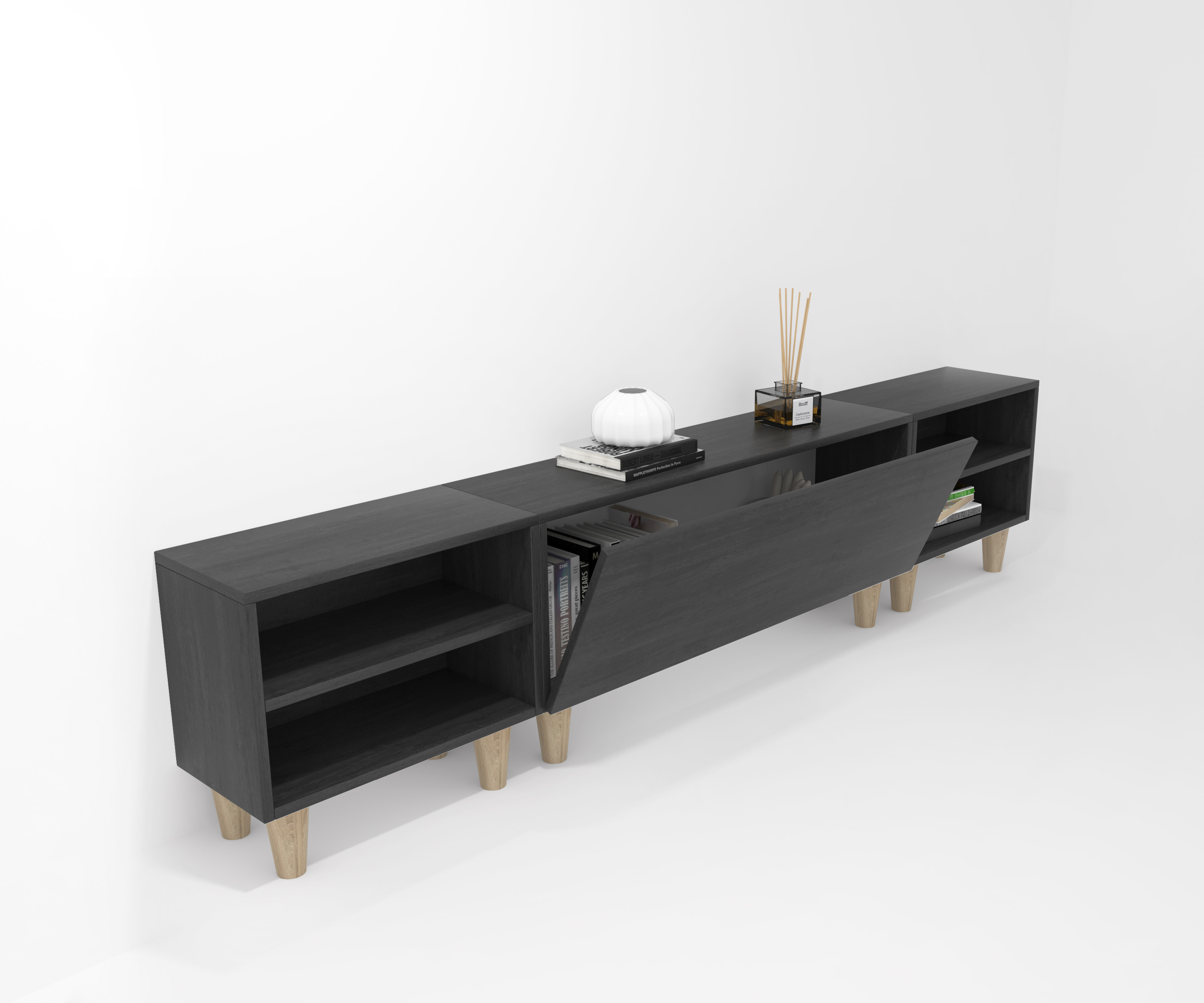 Pack formado por dos muebles con puerta abatible y un mueble decorativo. Infinidad de combinaciones posibles con todos los módulos o composiciones de la colección CREA. Mueble fabricado en tablero laminado de partículas . Gran capacidad de almacenaje interior. Preparado para ser colgado en la pared con posibilidad de añadir patas o ruedas. Se entrega desmontado, fácil montaje. Fabricado en España.