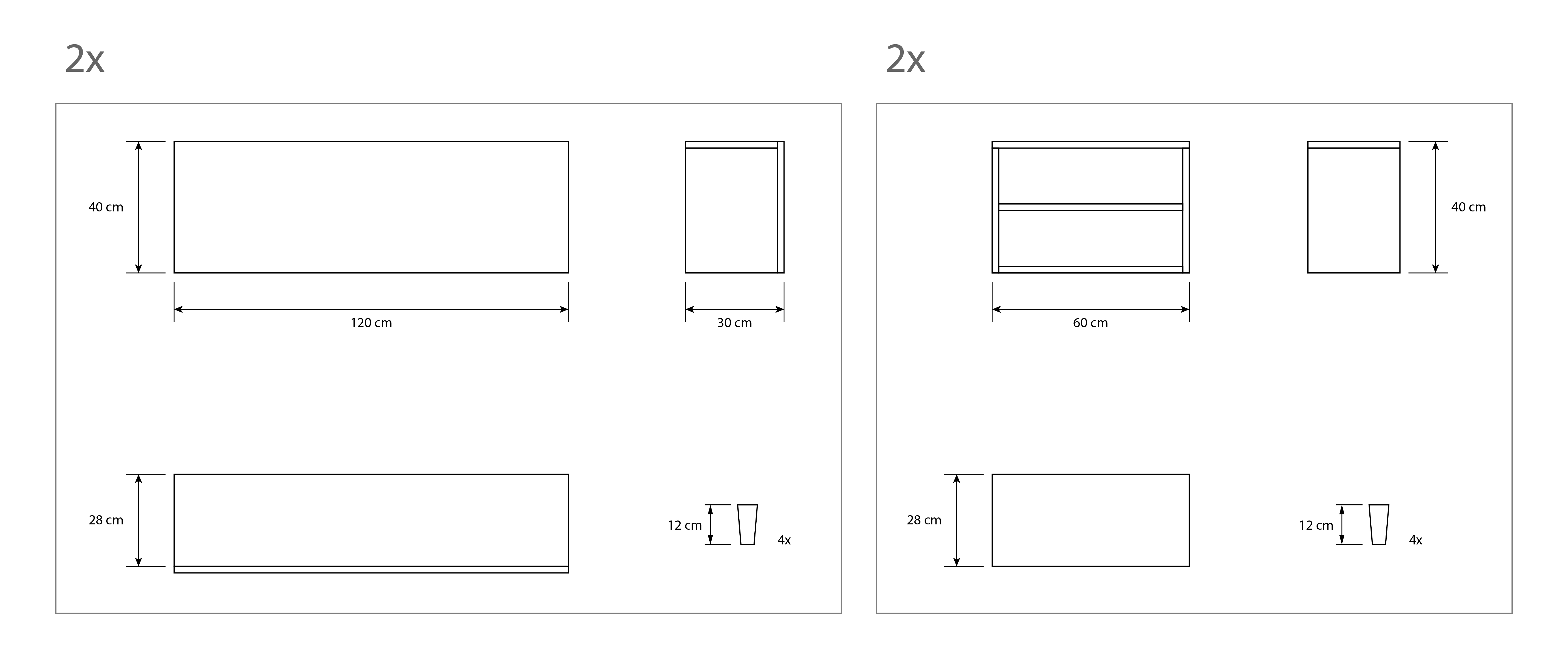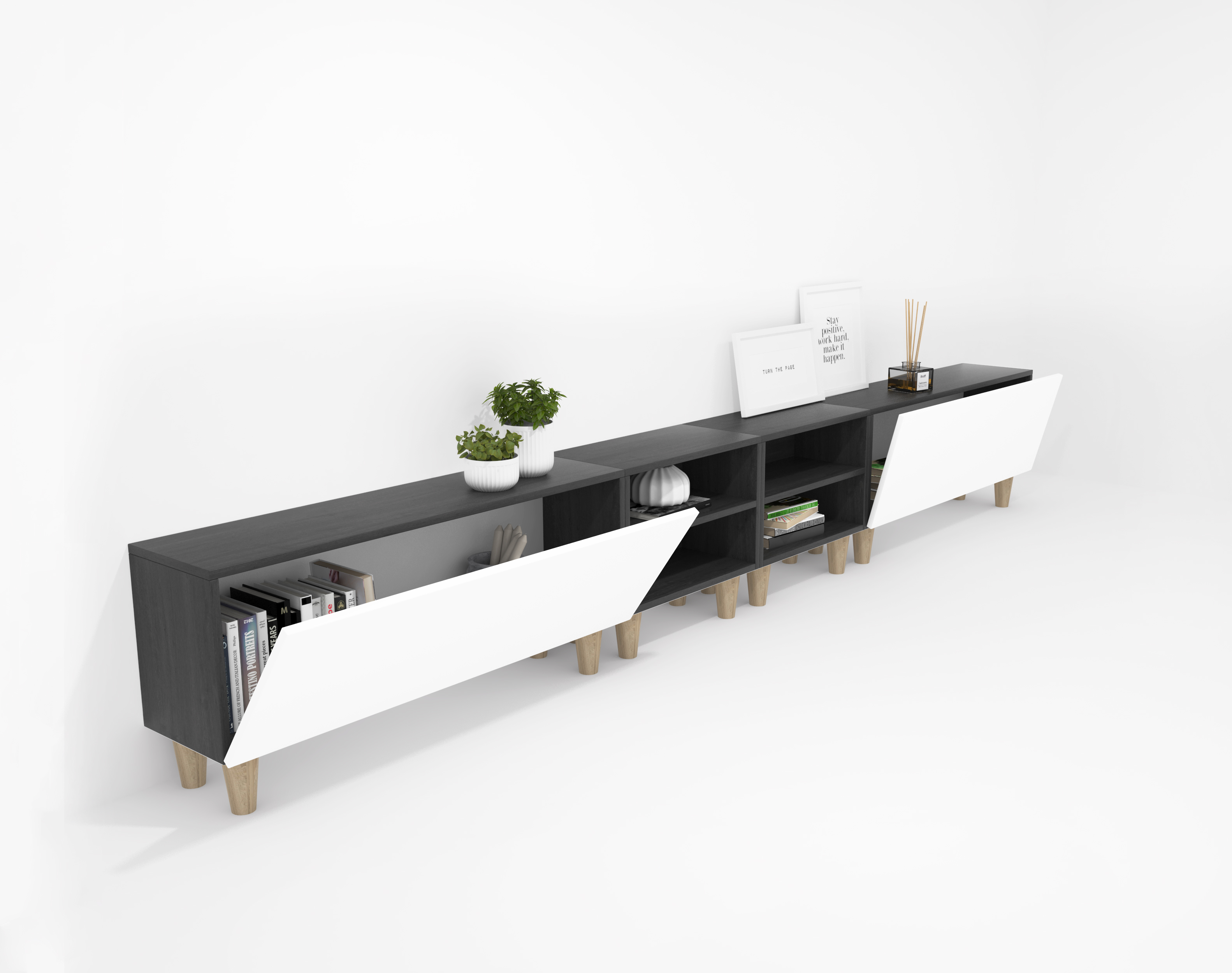 Pack formado por dos muebles con puerta abatible y dos muebles decorativos. Infinidad de combinaciones posibles con todos los módulos o composiciones de la colección CREA. Mueble fabricado en tablero laminado de partículas . Gran capacidad de almacenaje interior. Preparado para ser colgado en la pared con posibilidad de añadir patas o ruedas. Se entrega desmontado, fácil montaje. Fabricado en España.