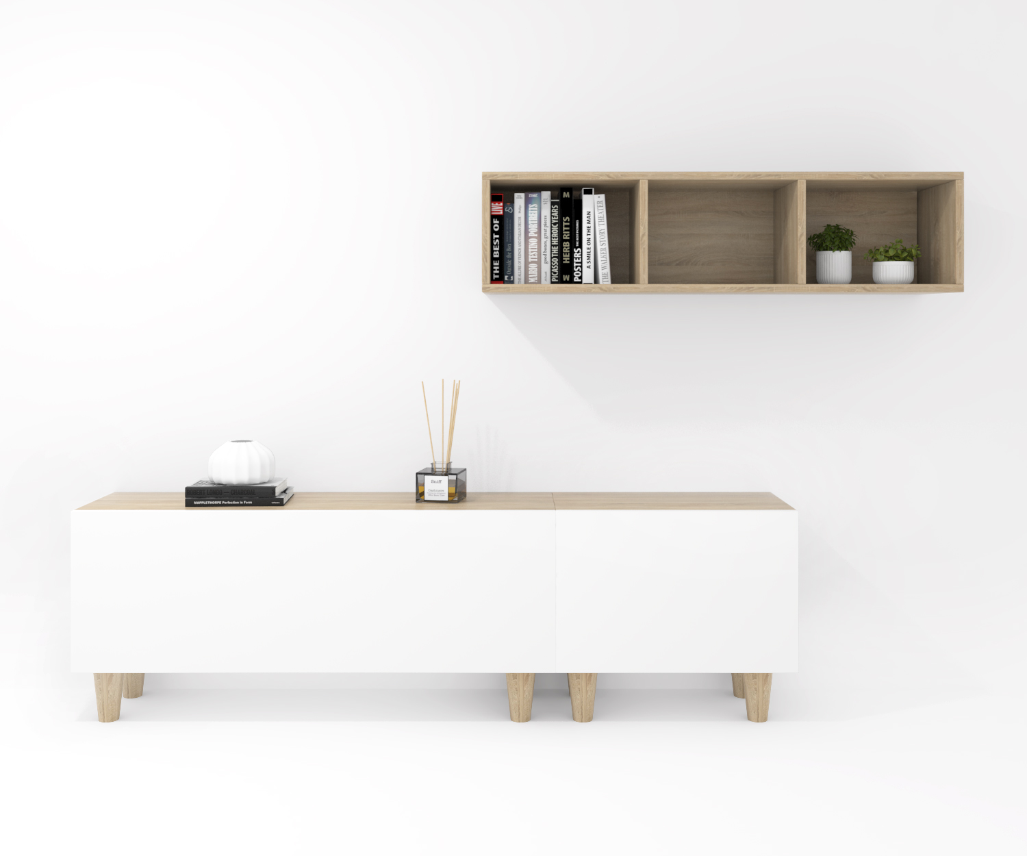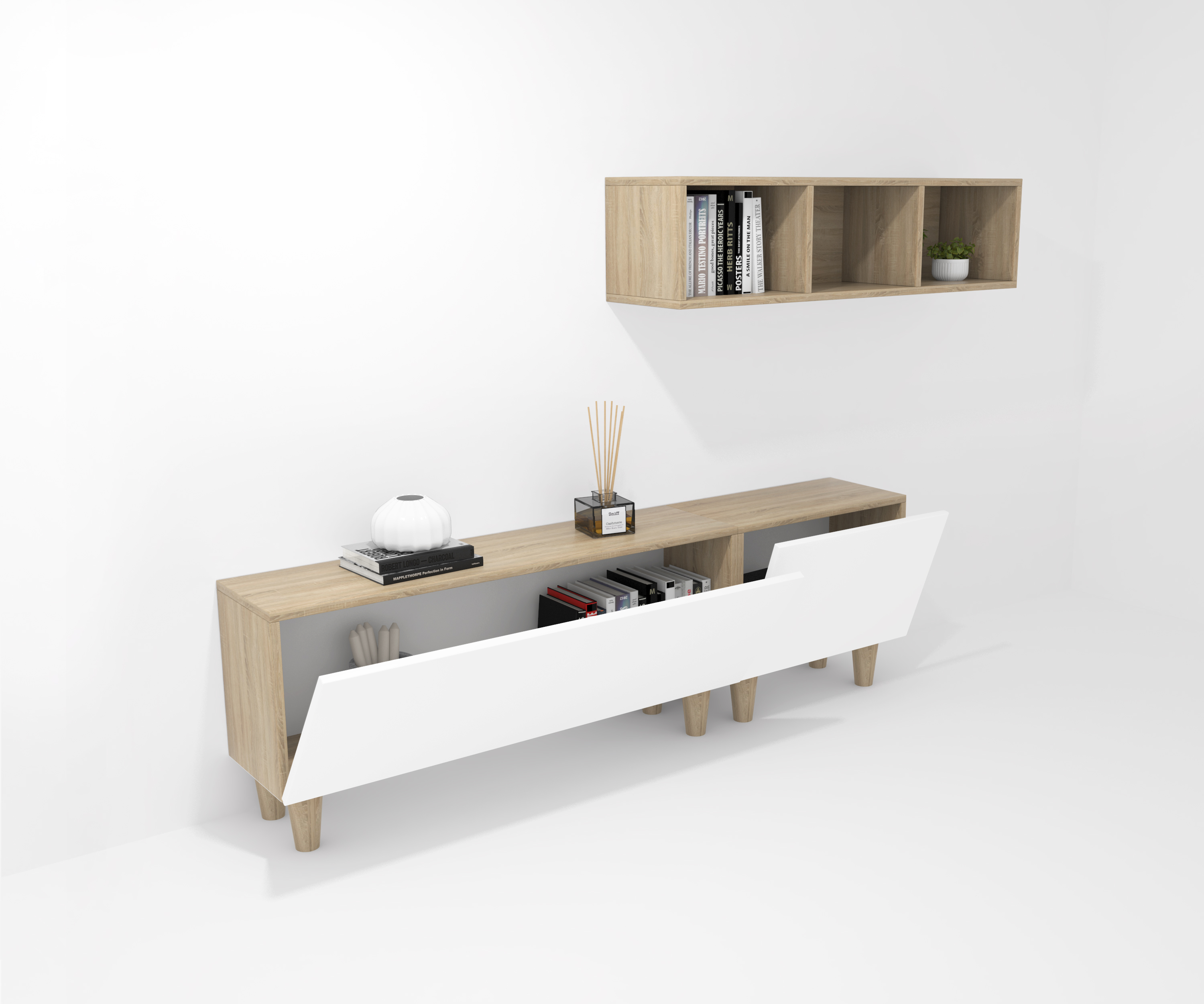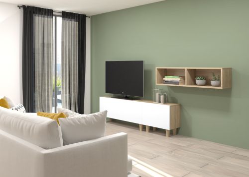 Pack formado por dos muebles con puerta abatible y un mueble decorativo. Infinidad de combinaciones posibles con todos los módulos o composiciones de la colección CREA. Mueble fabricado en tablero laminado de partículas . Gran capacidad de almacenaje interior. Preparado para ser colgado en la pared con posibilidad de añadir patas o ruedas. Se entrega desmontado, fácil montaje. Fabricado en España.