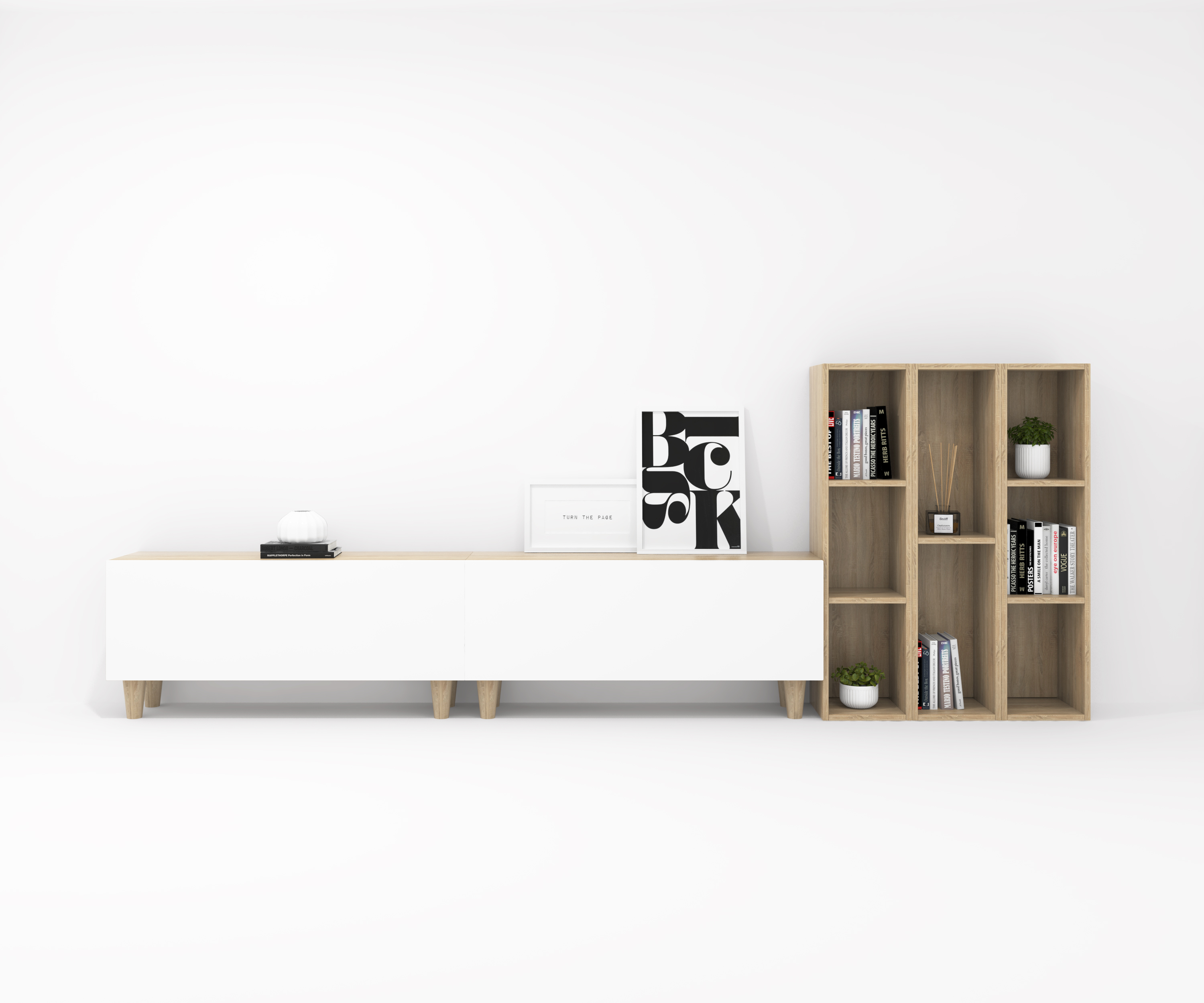 Pack formado por dos muebles con puerta abatible y tres muebles decorativos. Infinidad de combinaciones posibles con todos los módulos o composiciones de la colección CREA. Mueble fabricado en tablero laminado de partículas . Gran capacidad de almacenaje interior. Preparado para ser colgado en la pared con posibilidad de añadir patas o ruedas. Se entrega desmontado, fácil montaje. Fabricado en España.