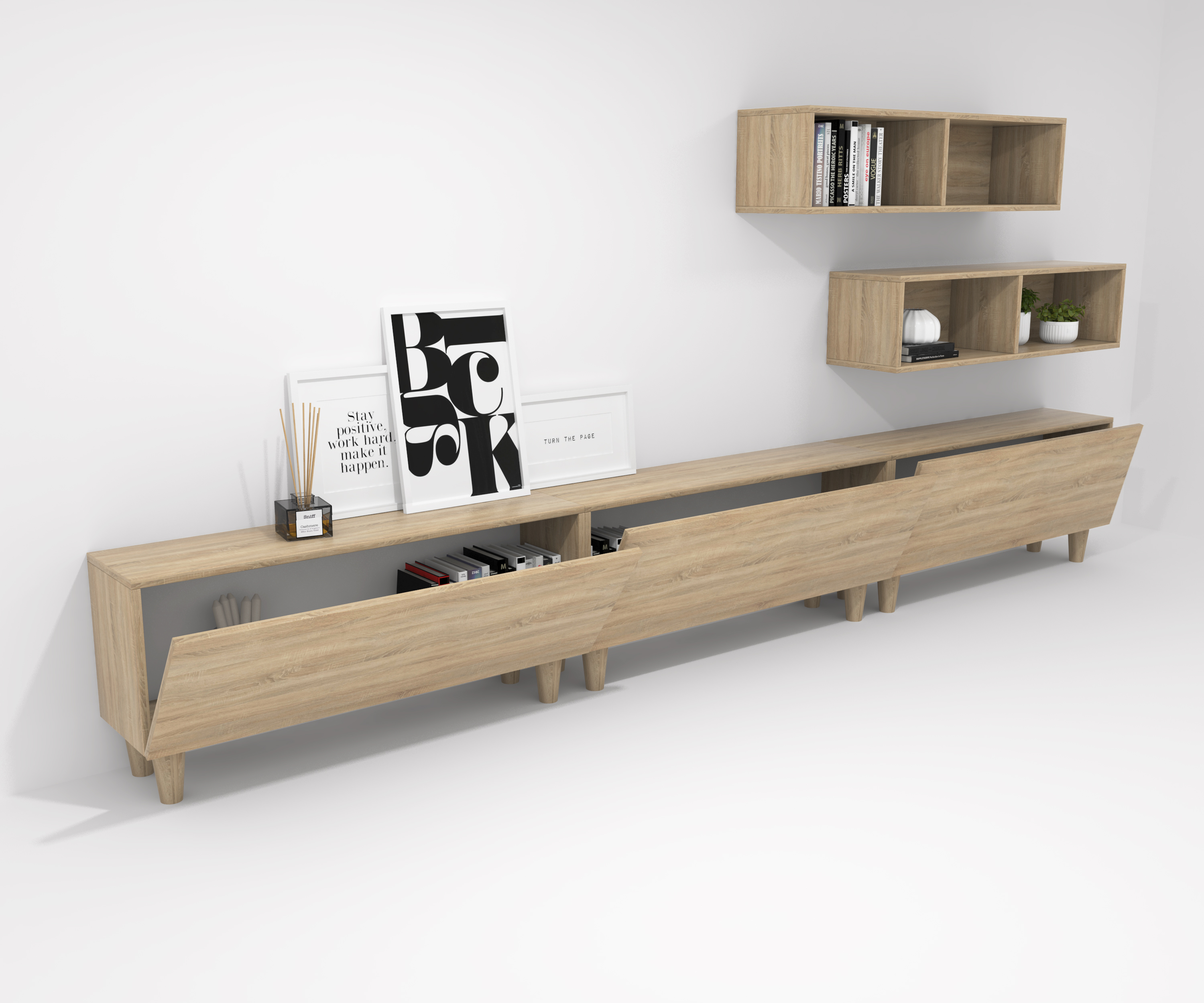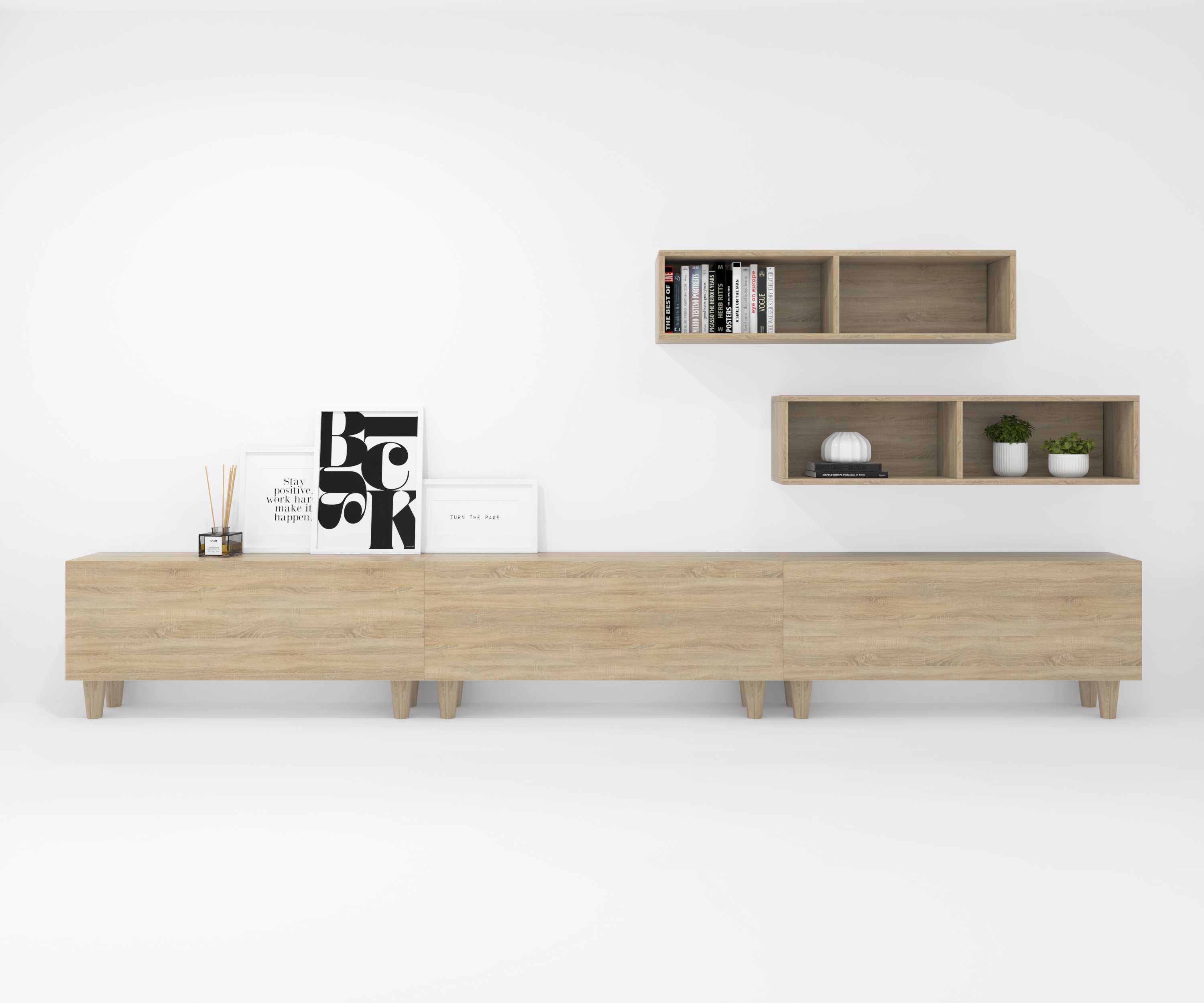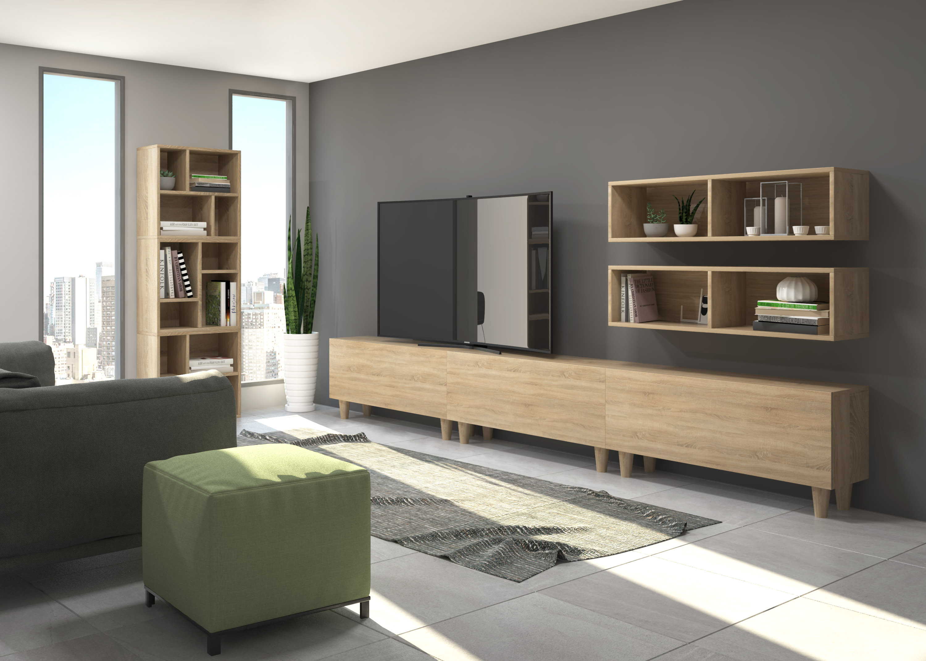 Pack formado por tres muebles con puerta abatible y dos muebles decorativos. Infinidad de combinaciones posibles con todos los módulos o composiciones de la colección CREA. Mueble fabricado en tablero laminado de partículas . Gran capacidad de almacenaje interior. Preparado para ser colgado en la pared con posibilidad de añadir patas o ruedas. Se entrega desmontado, fácil montaje. Fabricado en España.