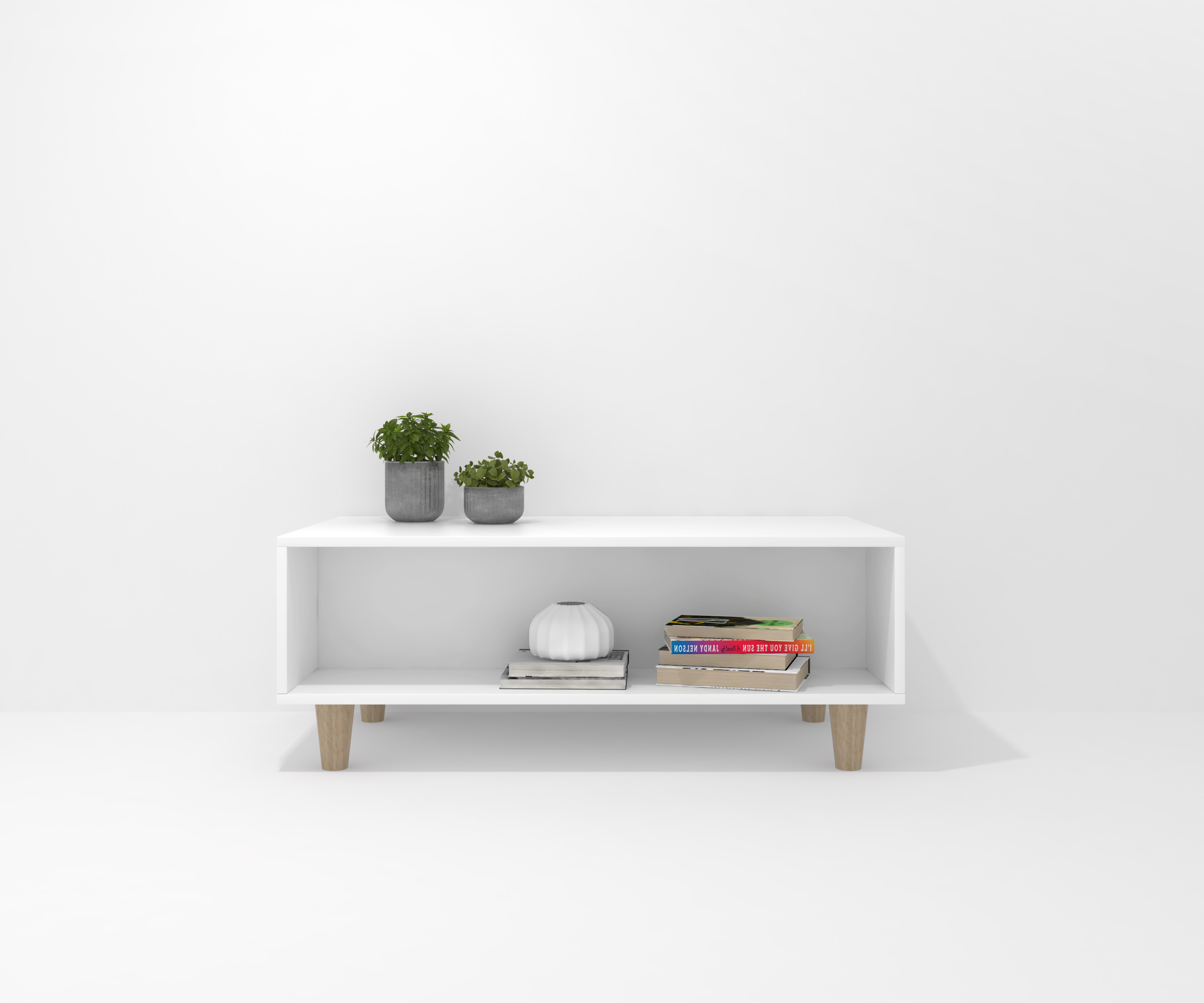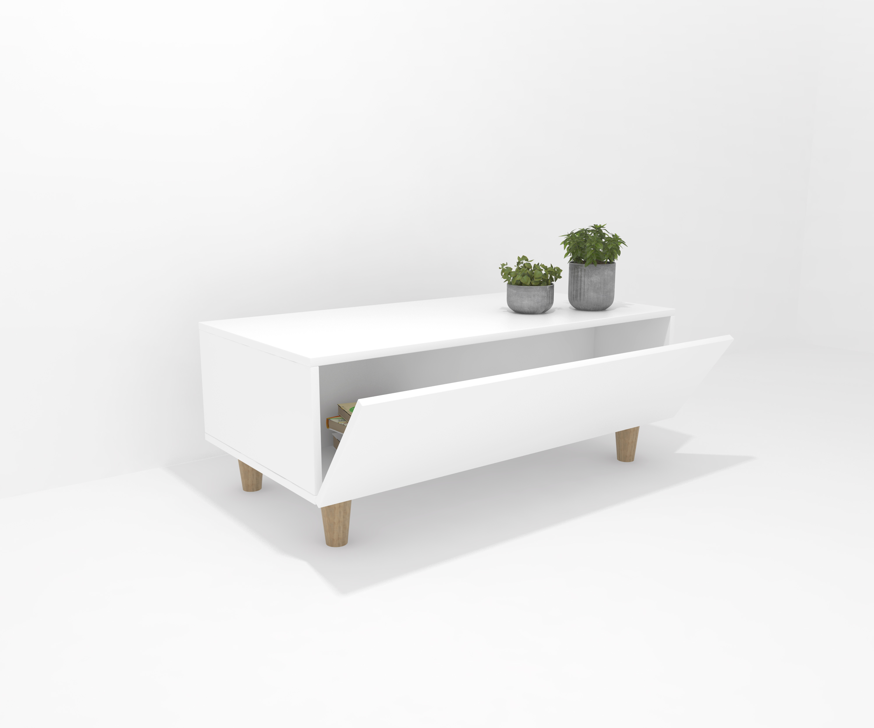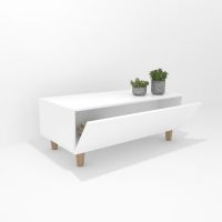 Mesa de centro fabricada en tablero laminado de partículas, con un espacio decorativo y un cajón abatible con capacidad de almacenaje. Infinidad de combinaciones posibles con todos los módulos o composiciones de la colección CREA. Patas de madera. Se entrega desmontado, fácil montaje. Fabricado en España.
