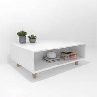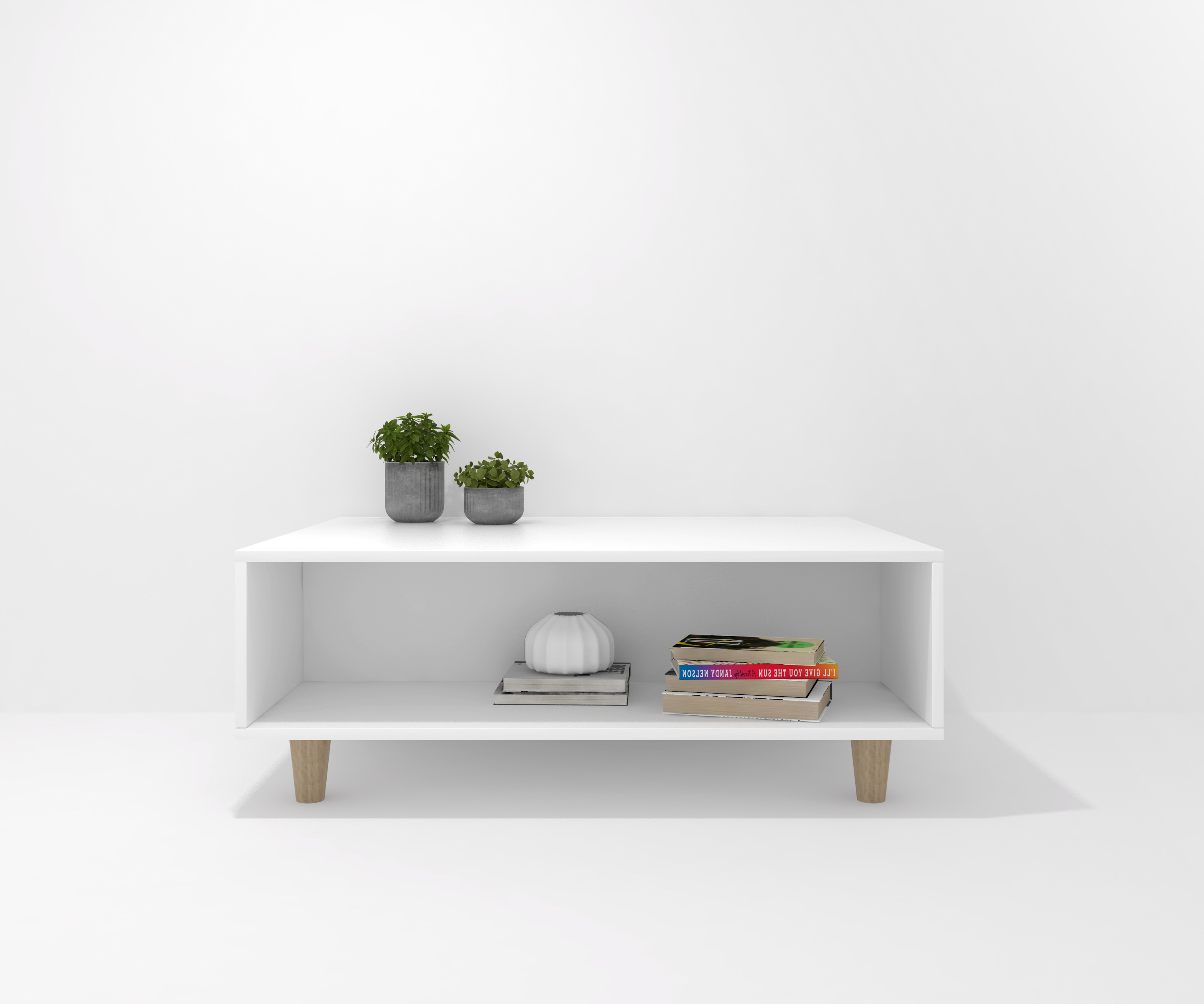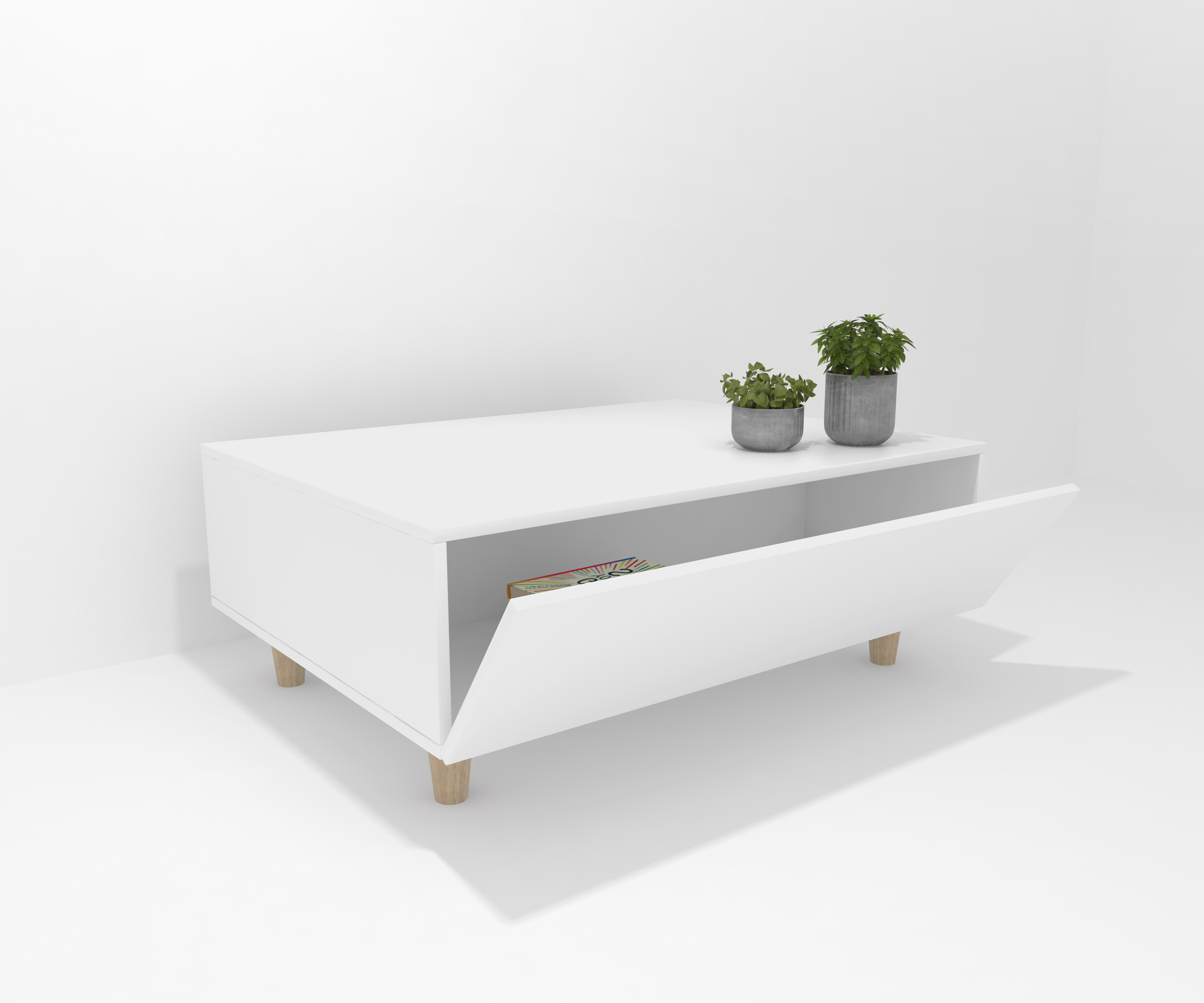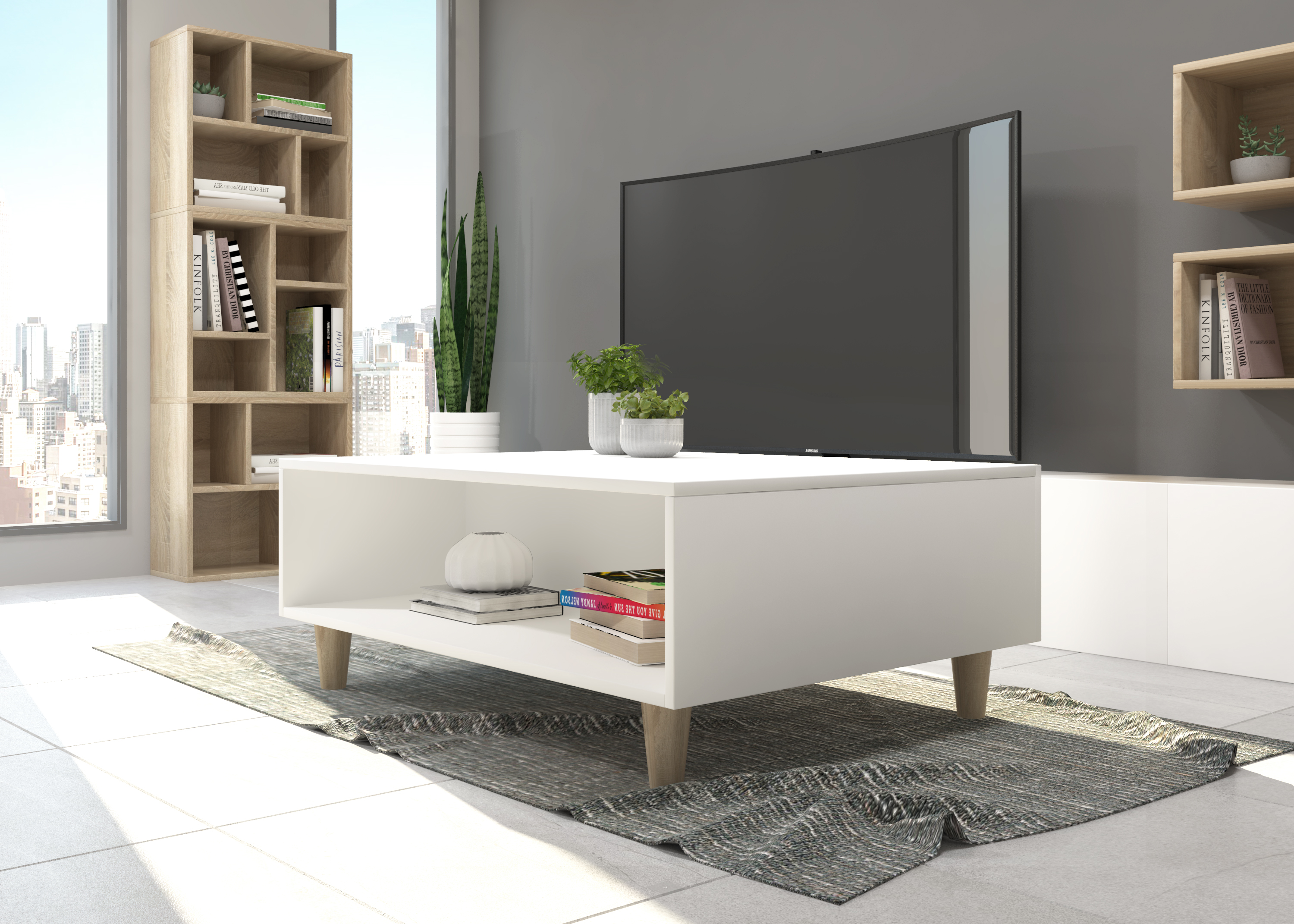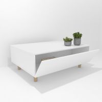 Mesa de centro fabricada en tablero laminado de partículas, con un espacio decorativo y un cajón abatible con capacidad de almacenaje. Infinidad de combinaciones posibles con todos los módulos o composiciones de la colección CREA. Patas de madera. Se entrega desmontado, fácil montaje. Fabricado en España.
