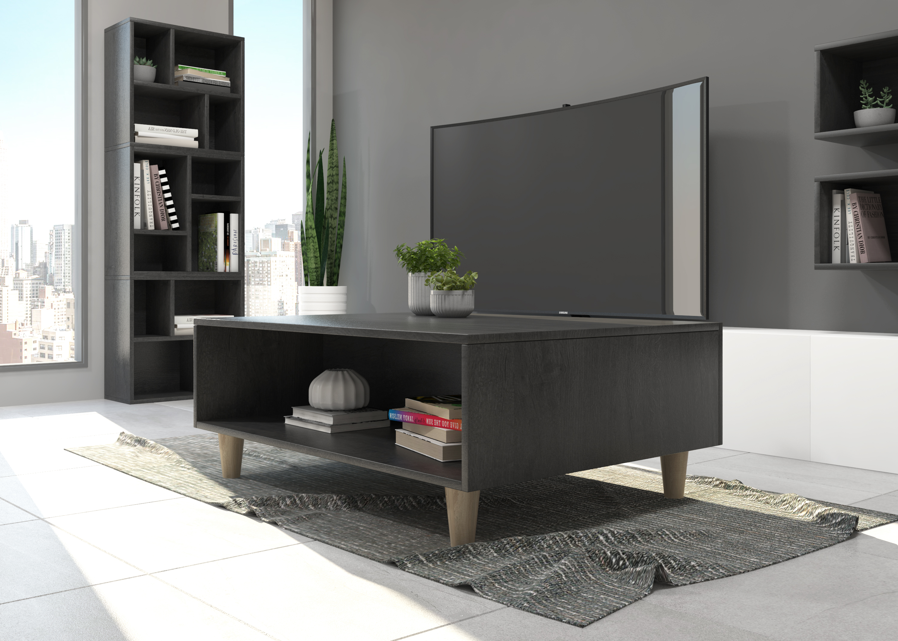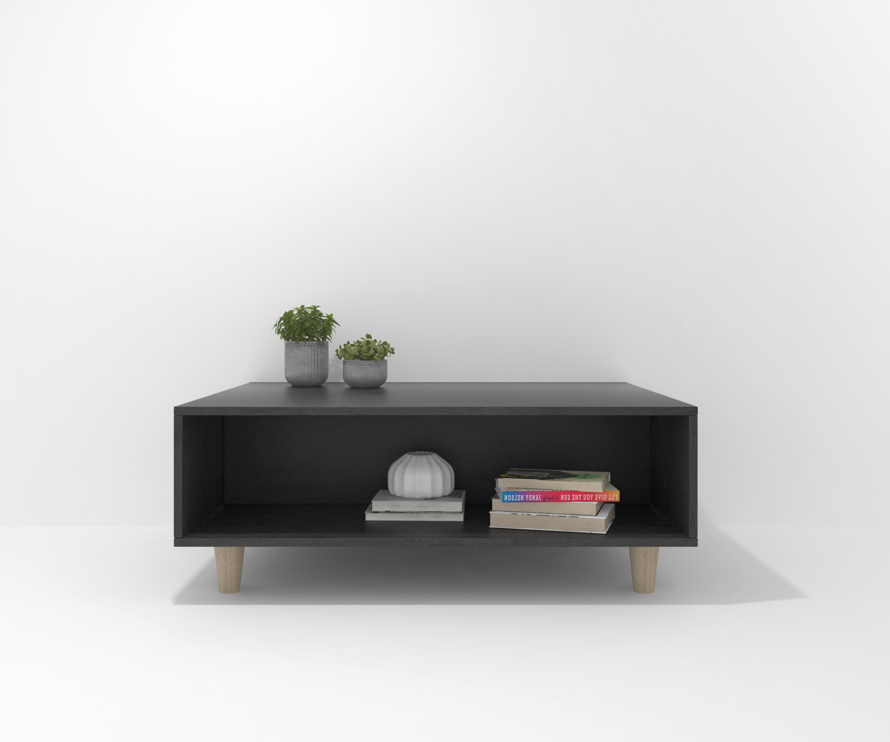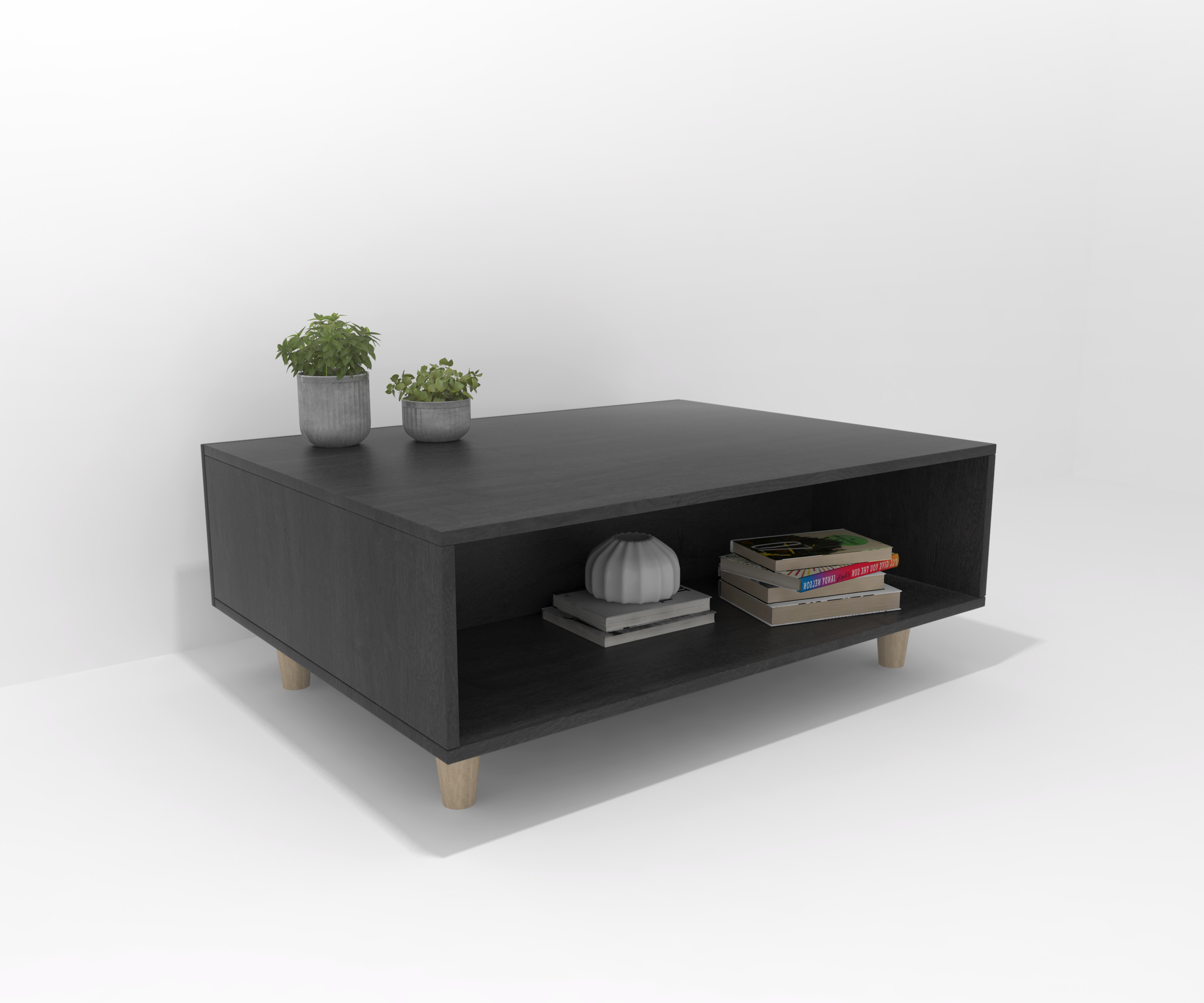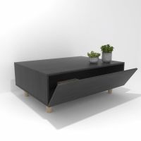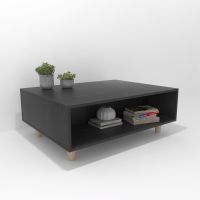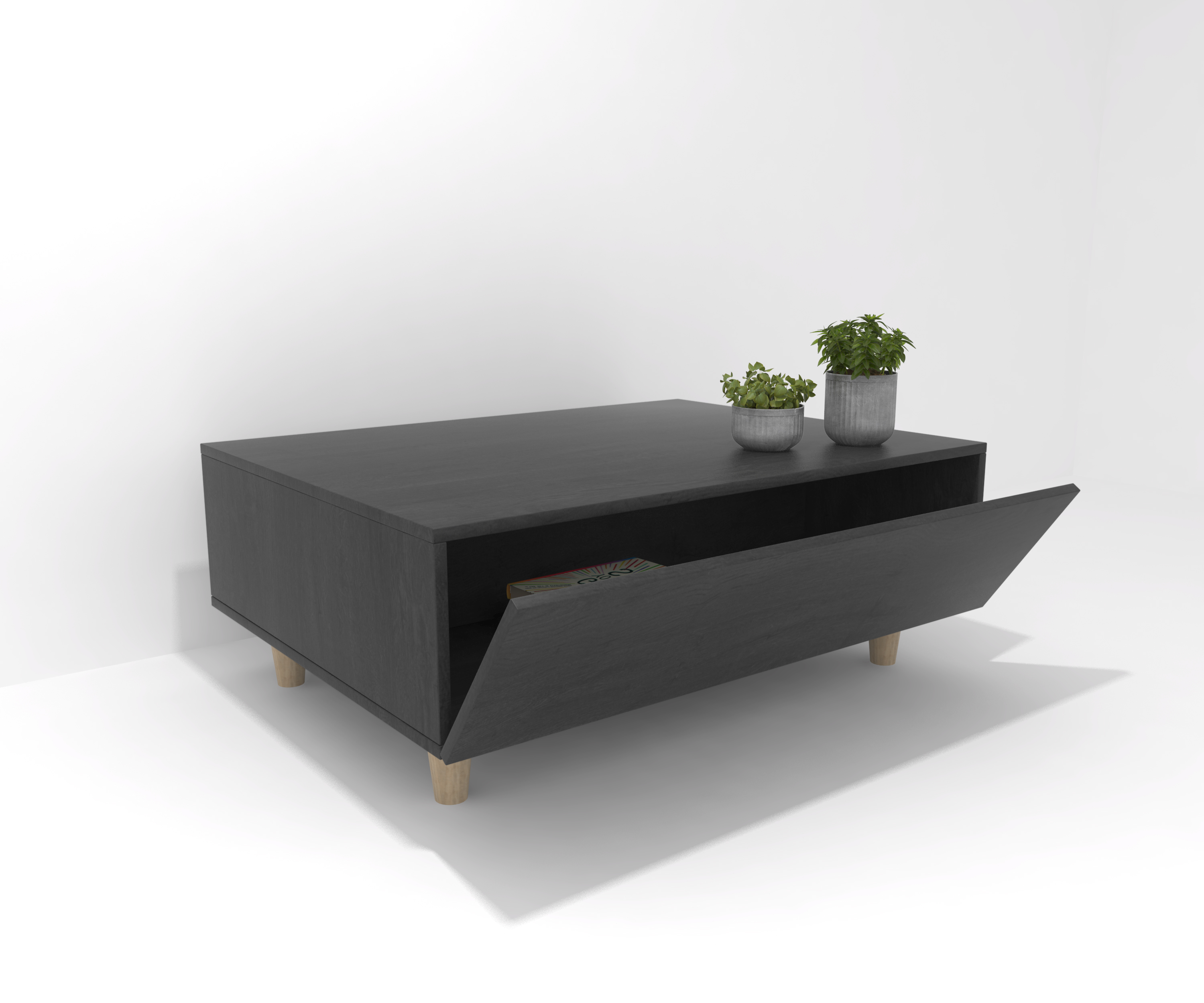 Mesa de centro fabricada en tablero laminado de partículas, con un espacio decorativo y un cajón abatible con capacidad de almacenaje. Infinidad de combinaciones posibles con todos los módulos o composiciones de la colección CREA. Patas de madera. Se entrega desmontado, fácil montaje. Fabricado en España.