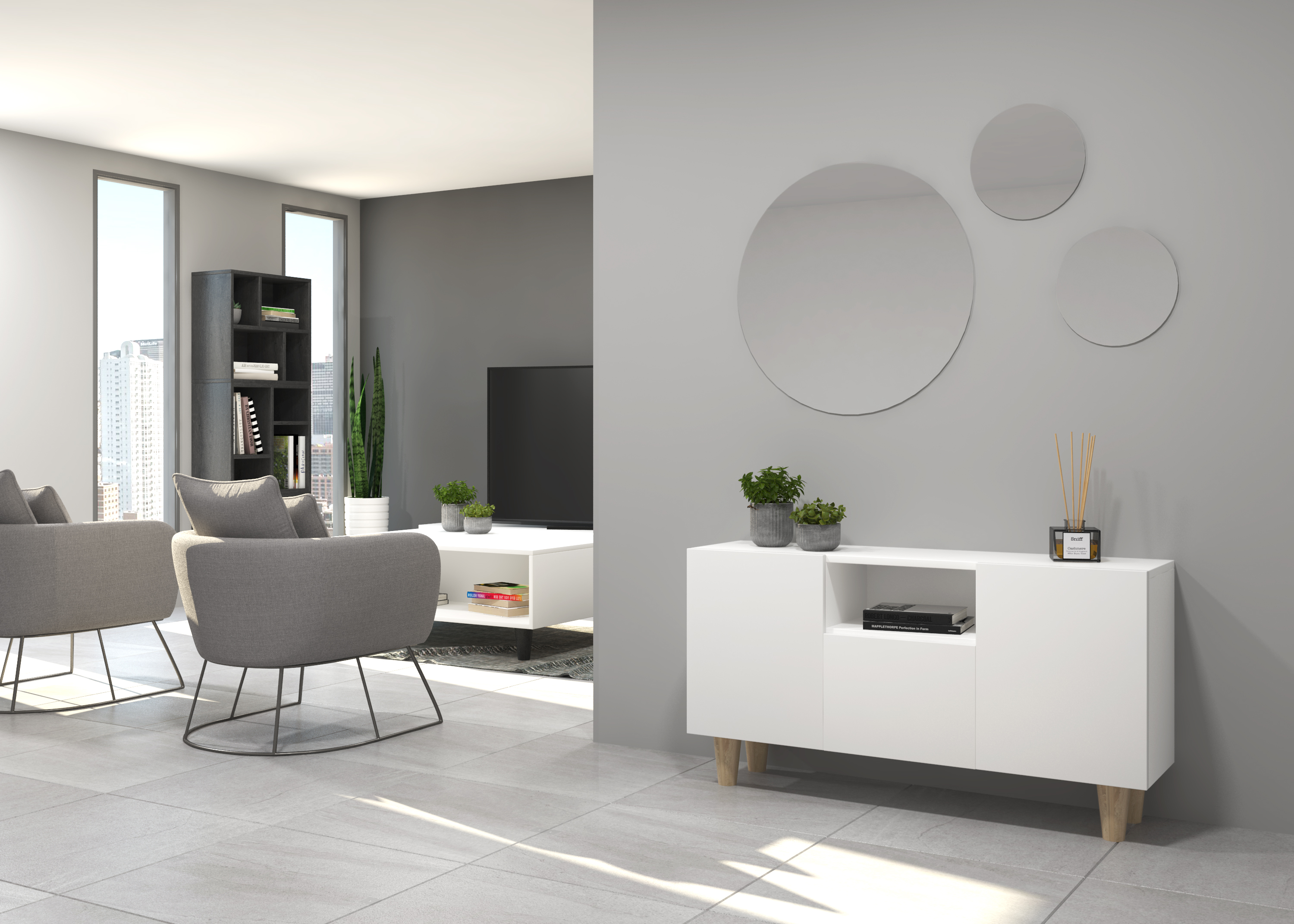 Mueble recibidor fabricado en tablero laminado de partículas. Infinidad de combinaciones posibles con todos los módulos o composiciones de la colección CREA. Se entrega desmontado, fácil montaje. Fabricado en España.
